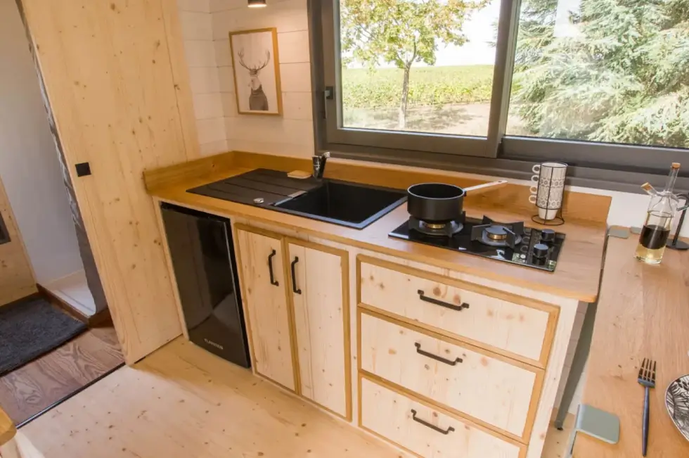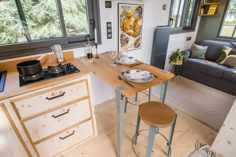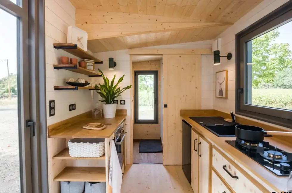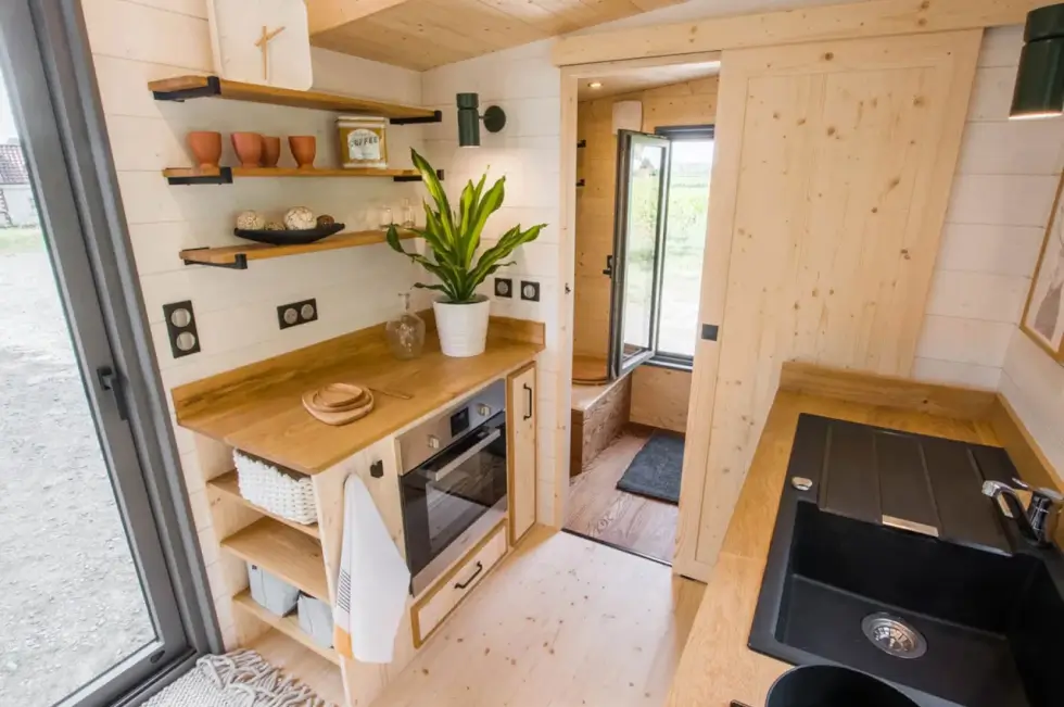 Baluchon opted not to have a mezzanine on this house to save weight and make it longer, as opposed to its other home designs. A large glass sliding door opens up the interior space to natural lighting to make it look bigger. The door opens up directly to a kitchen equipped with a sink, a propane-powered two-burner stove, an oven, a small fridge and custom cabinetry. An oak table near the stove serves as dining or recreational table as it can be moved.