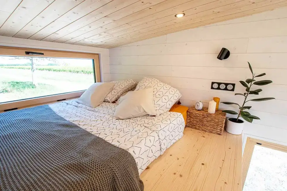 The main bedroom has a low ceiling and a double bed, and has no protective railing on its edge. Below it is a small bathroom with a shower and toilet. The house offers the functionality of a residential home while staying compact for hassle-free transport.