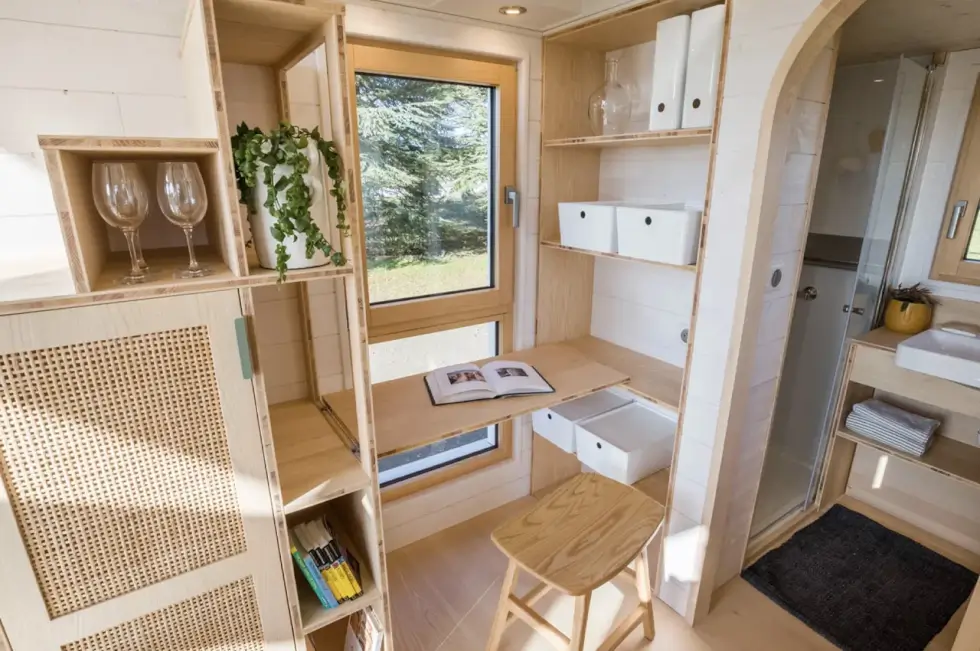 Bois Perdus has several glazing that makes the interior look bigger and brighter. Aside from large glass windows in the living area, there are also a couple of windows at the office and the sink faces out to one too. Another is discreetly placed near the bookshelf behind a built-in table. Currently, this home serves as a towable office but the office area can be turned into a kitchen in the future.