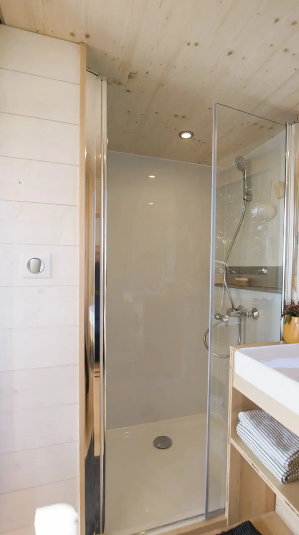 There’s also a loft-type shelf for storage and a wood-burning stove to heat up the entire house. Bois Perdus also has a long table near the living room that extends to the opposite end, which hosts the bathroom with a shower, a sink, and a toilet. There is a bookshelf propped against the wall next to the bathroom entrance.