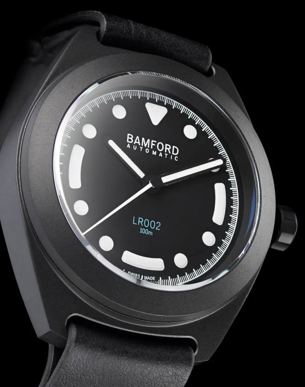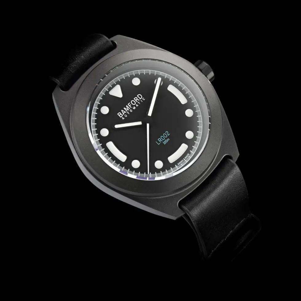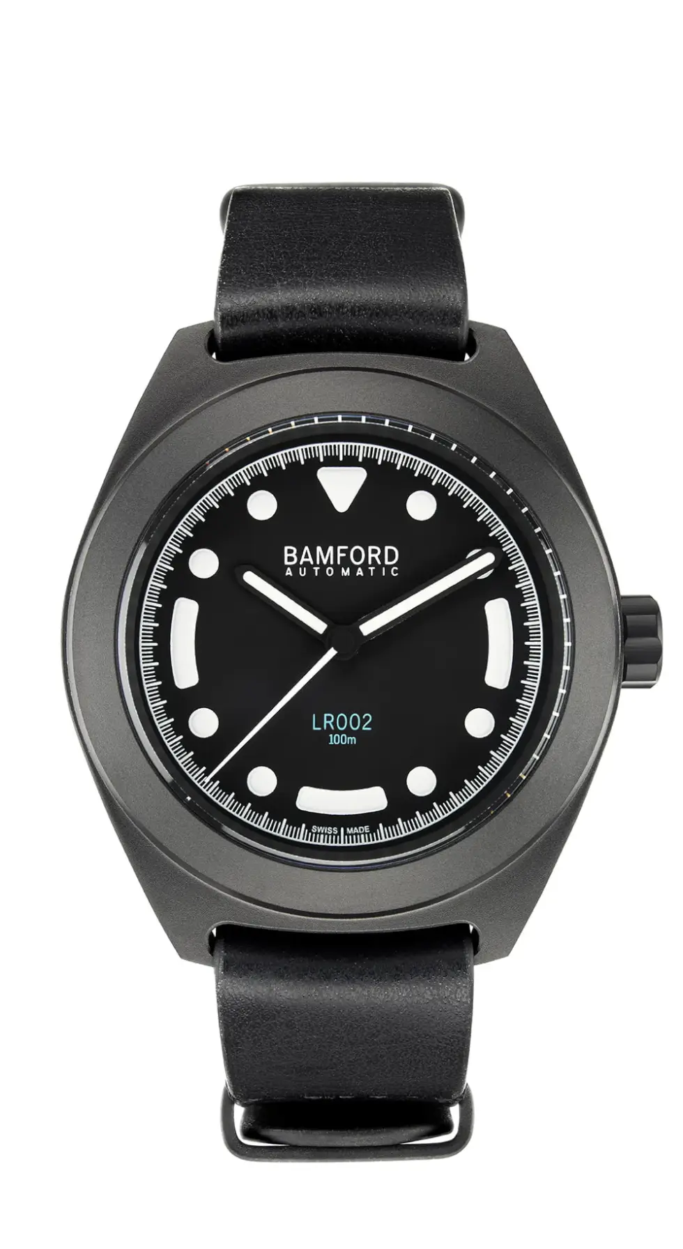The reliable 26-jewel caliber is rated at 28,800 vph with a 41-hour power reserve. The black dial is contrasted with a white minute track and hour markers. The Bamford signature is at 12 o’clock, while the LR002 model designation is in blue at 6 o’clock. Finally, a black leather strap with a matching pin buckle closure completes the watch’s dark theme.
