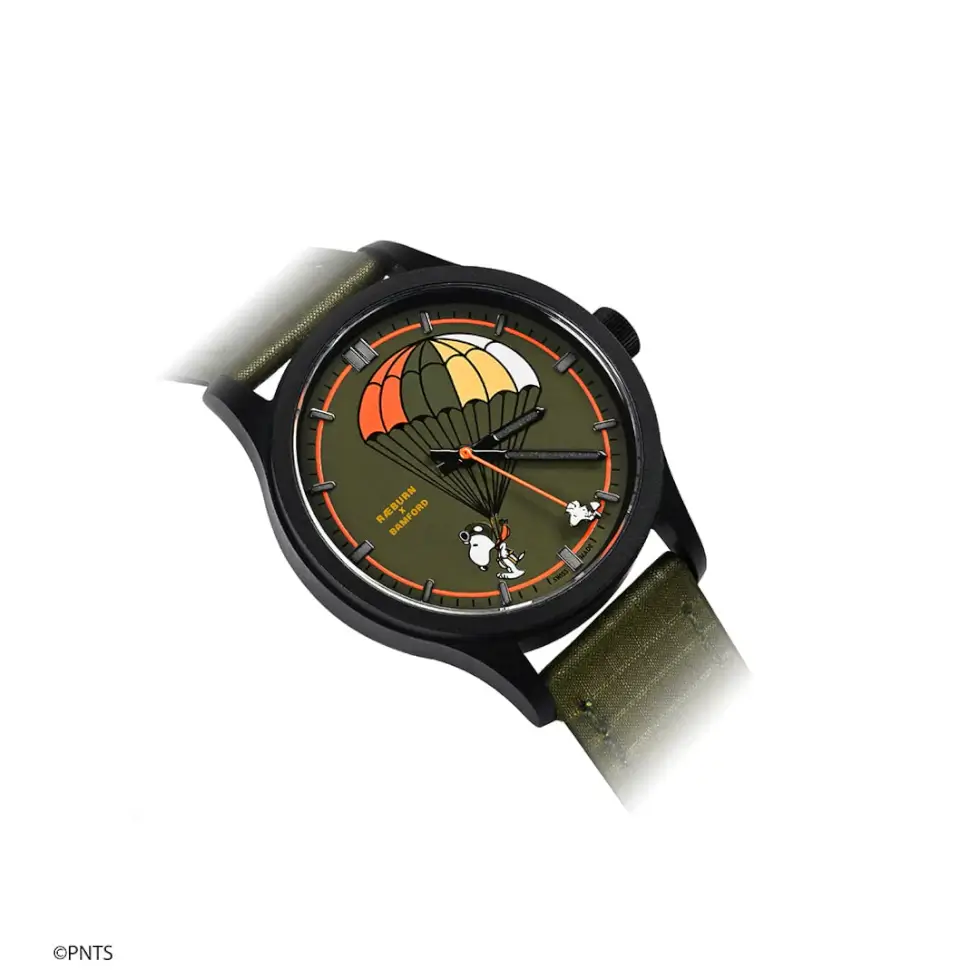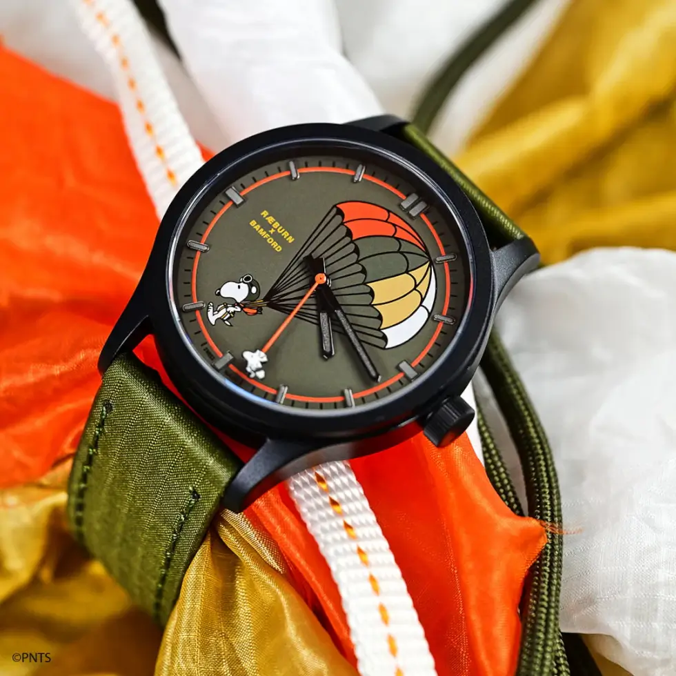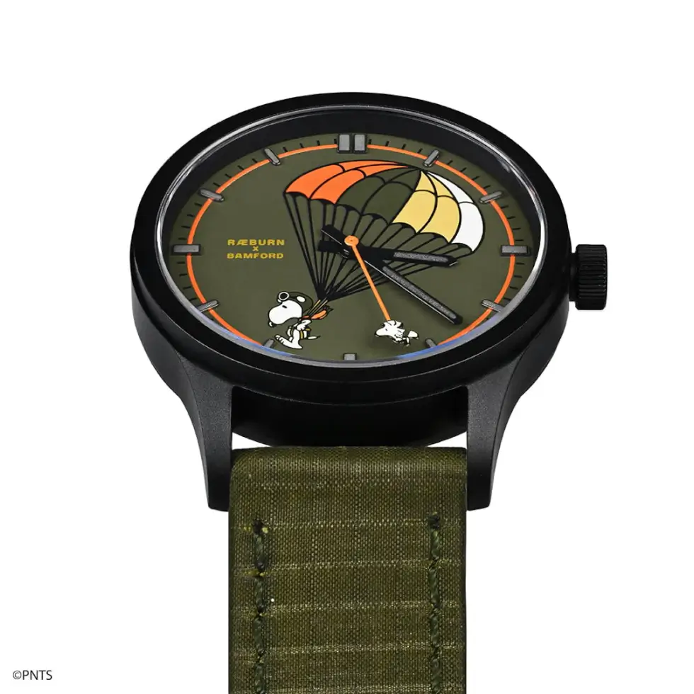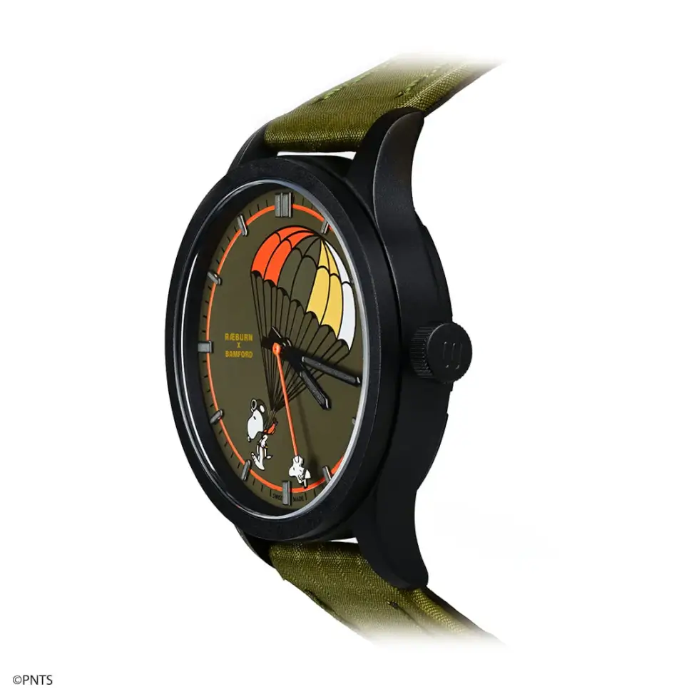 Meanwhile, Woodstock is designated as the pointer of the seconds hand. Ticking within is a Sellita SW300-1 self-winding caliber. The 25-jewel automatic movement is rated at 28,800 vph and boasts a 56-hour power reserve. Every Bamford x RÆBURN Snoopy B80 Limited-Edition ships with a synthetic strap made out of recycled RÆBURN parachute material.