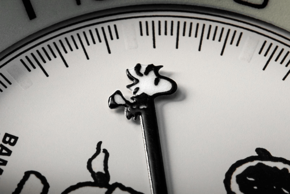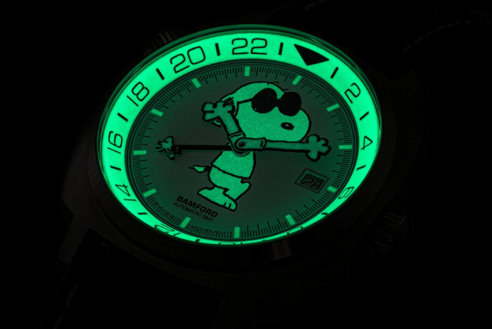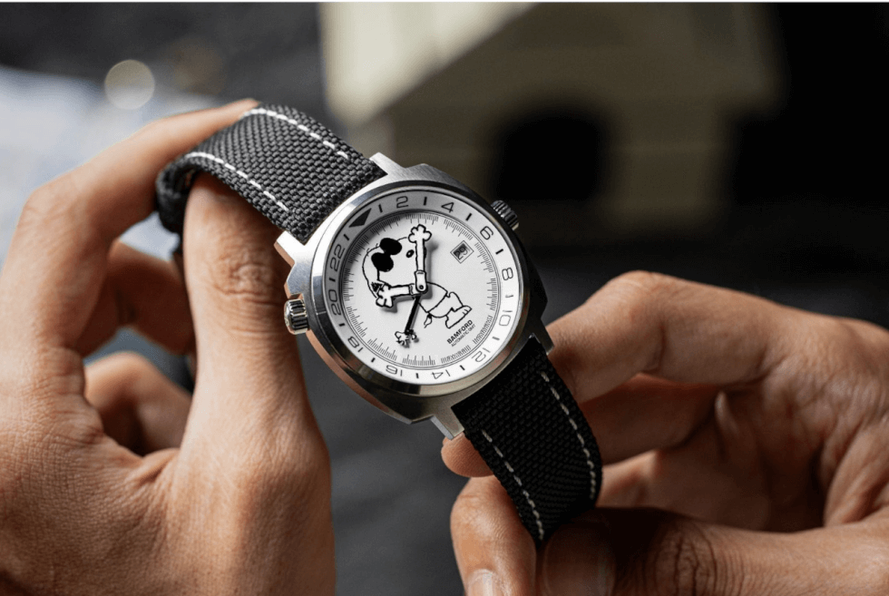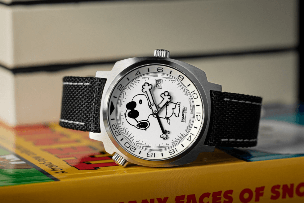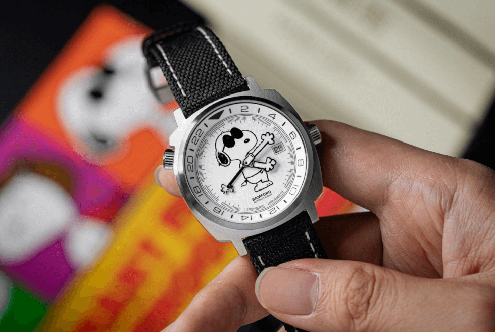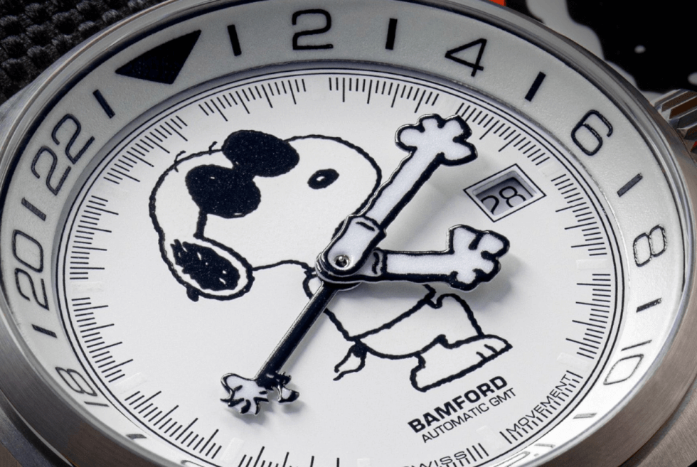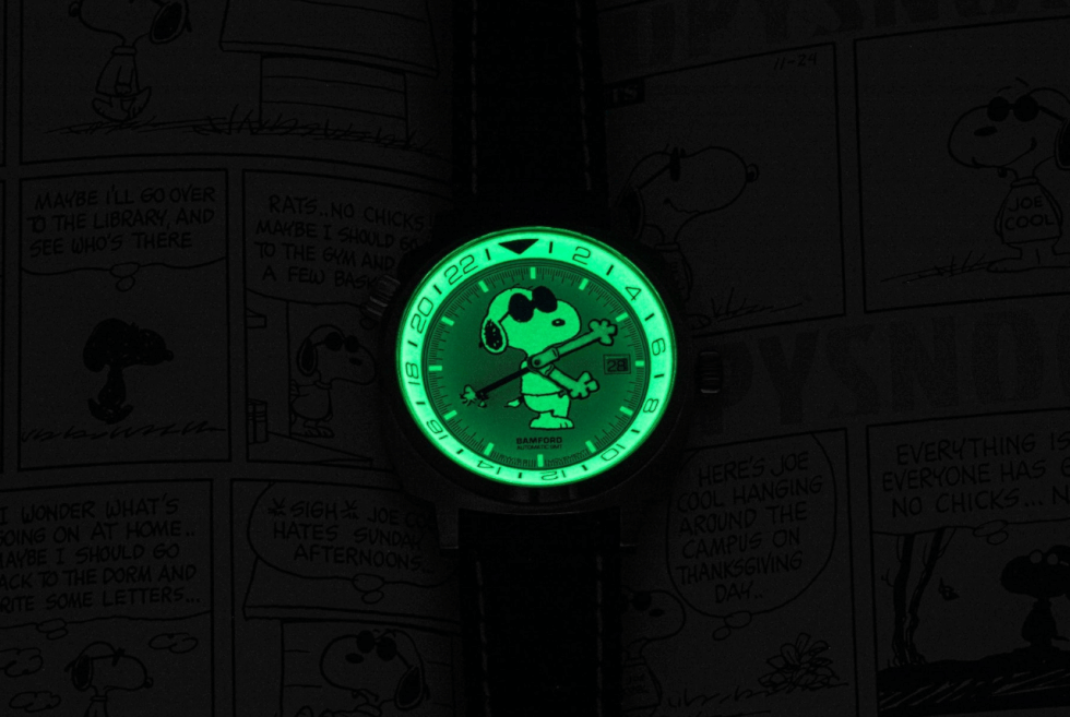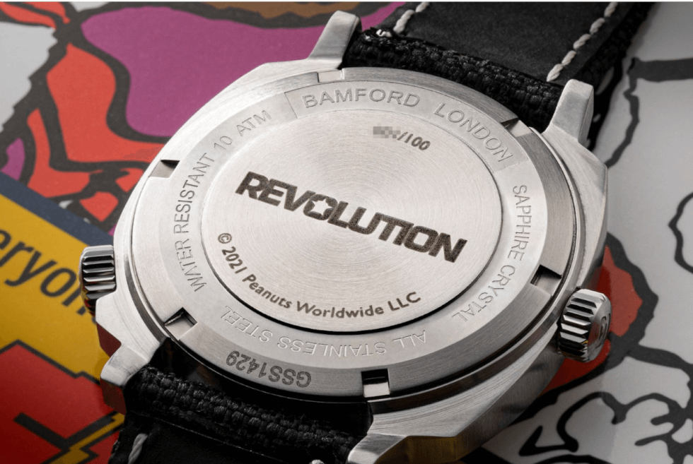 Among the huge cast, Snoopy is the most popular. Charlie Brown’s beloved beagle regularly earns the spotlight for his wild imagination. Among the countless alter egos the pooch created; Joe Cool is perhaps the most iconic. Therefore, the Bamford x Revolution collaboration dedicates this timepiece to his suave persona.