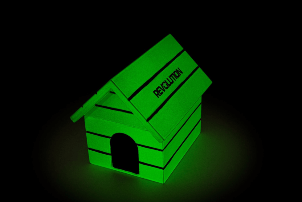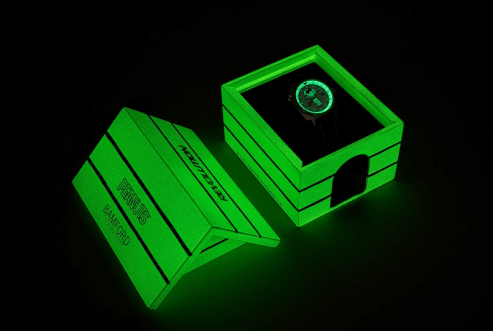 The outer ring is an internal rotating bezel that you turn via the crown at 10 o’clock. The Bamford x Revolution GMT Joe Cool ships in a special packaging that looks like Snoopy’s doghouse. Moreover, just like the lume on the watch, the box also glows.