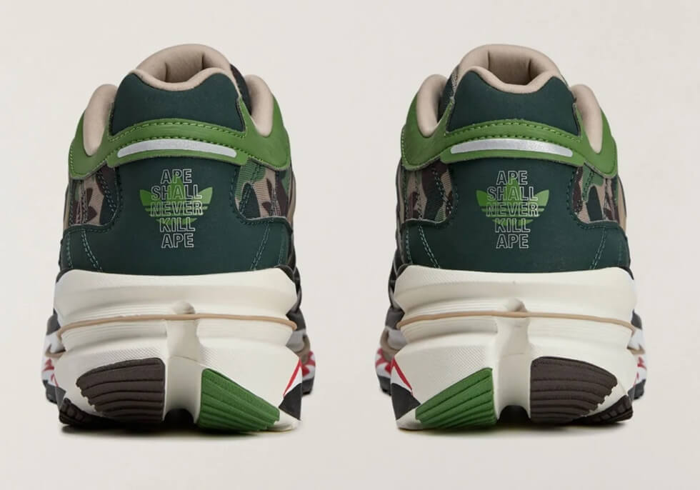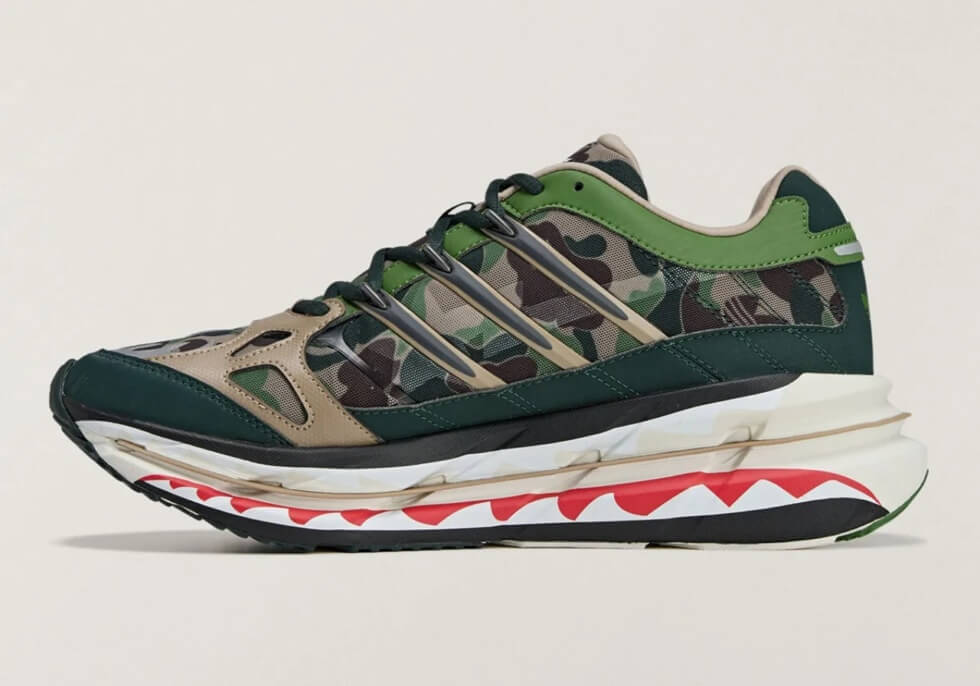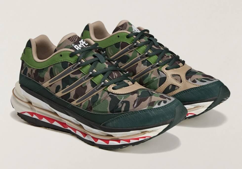 Leading the BAPE x Adidas “World Cup” Pack is the Adistar HRMY. This bad boy flaunts a green ABC CAMO upper and Shark Teeth graphics on the midsole. Expect these sneakers to hit retailers later this week.
