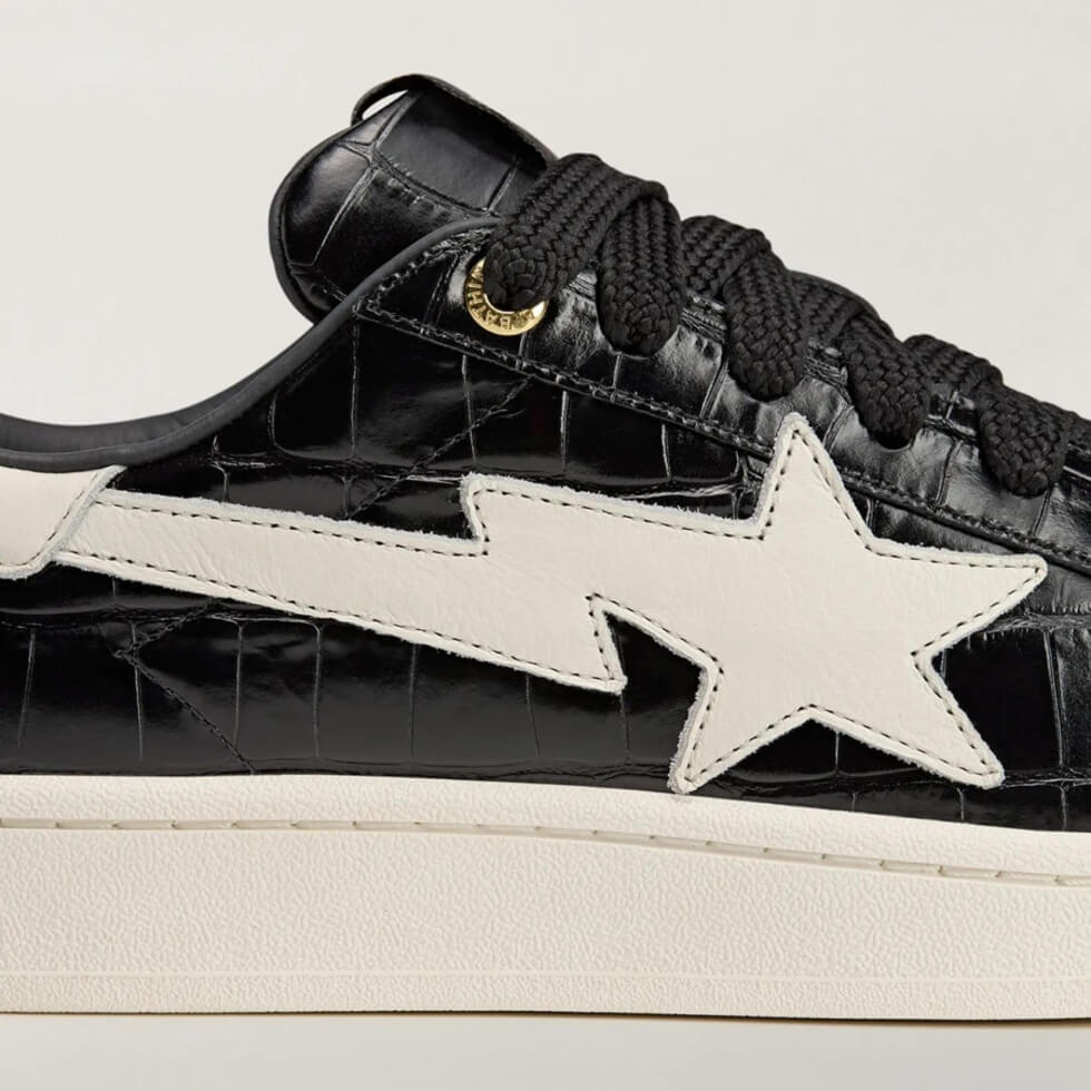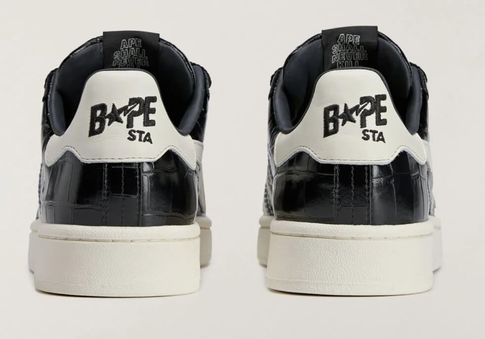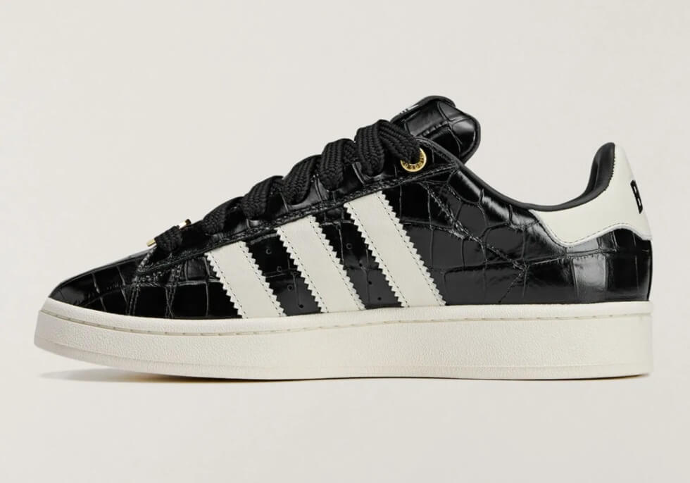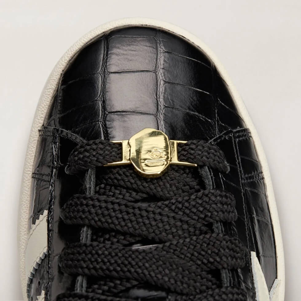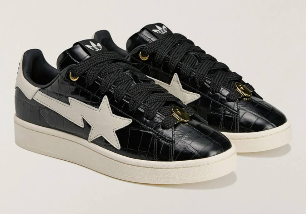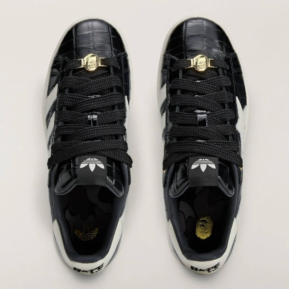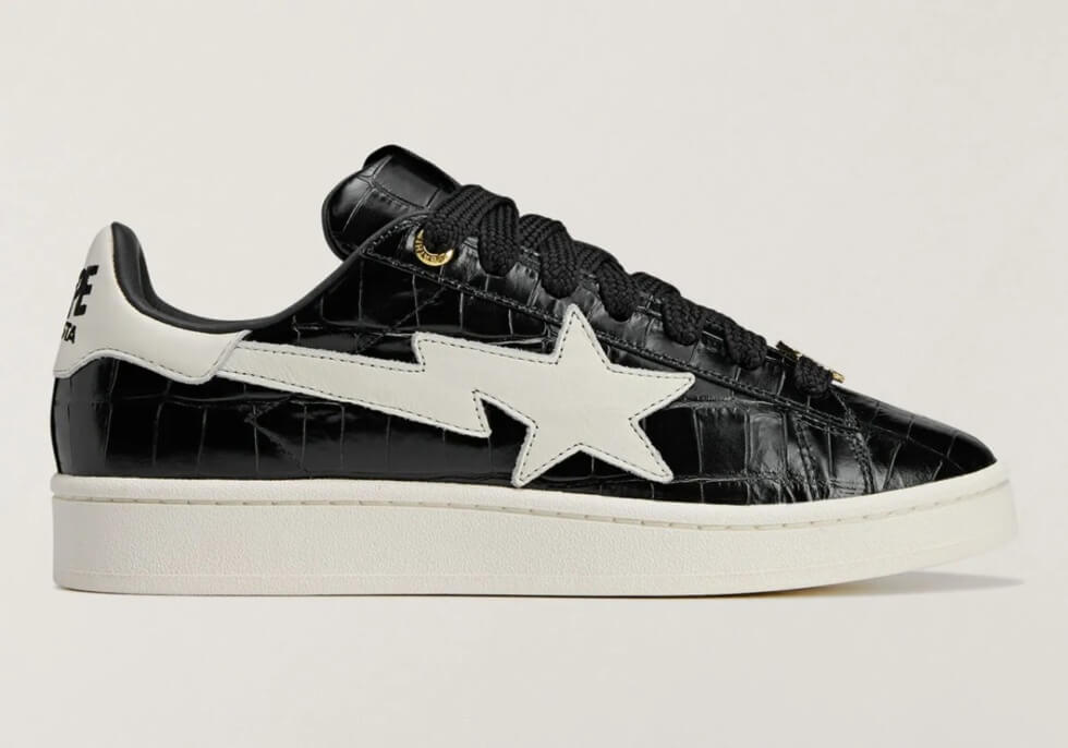Next is the Campus 00, which arrives with a black leather upper in a crocodile skin texture. A white BAPE STA occupies the lateral side, while the three strips likewise appear on the medial section. Golden accents add a dazzling contrast in addition to the white rubber sole.