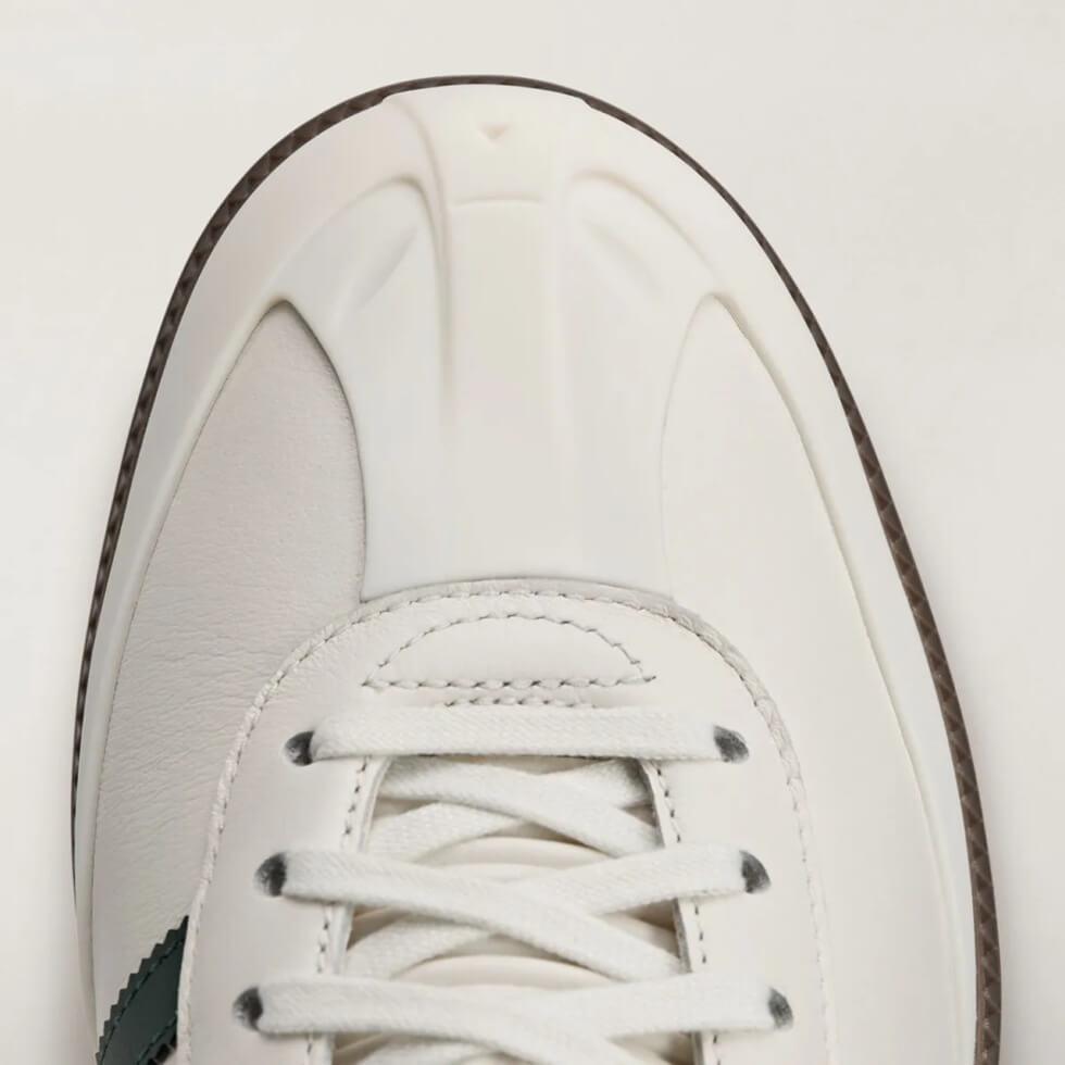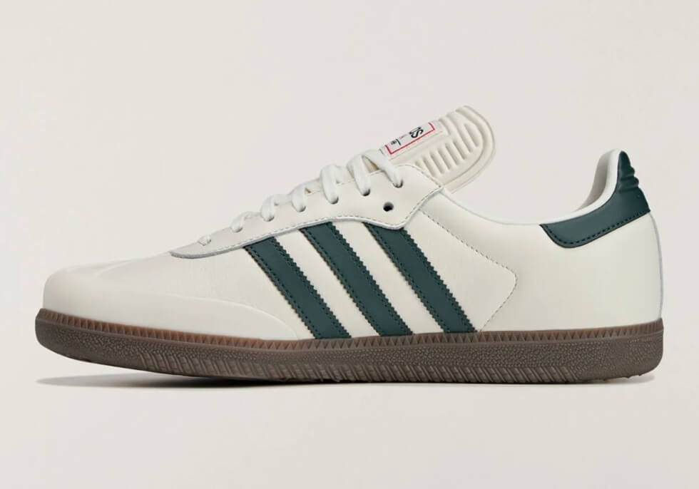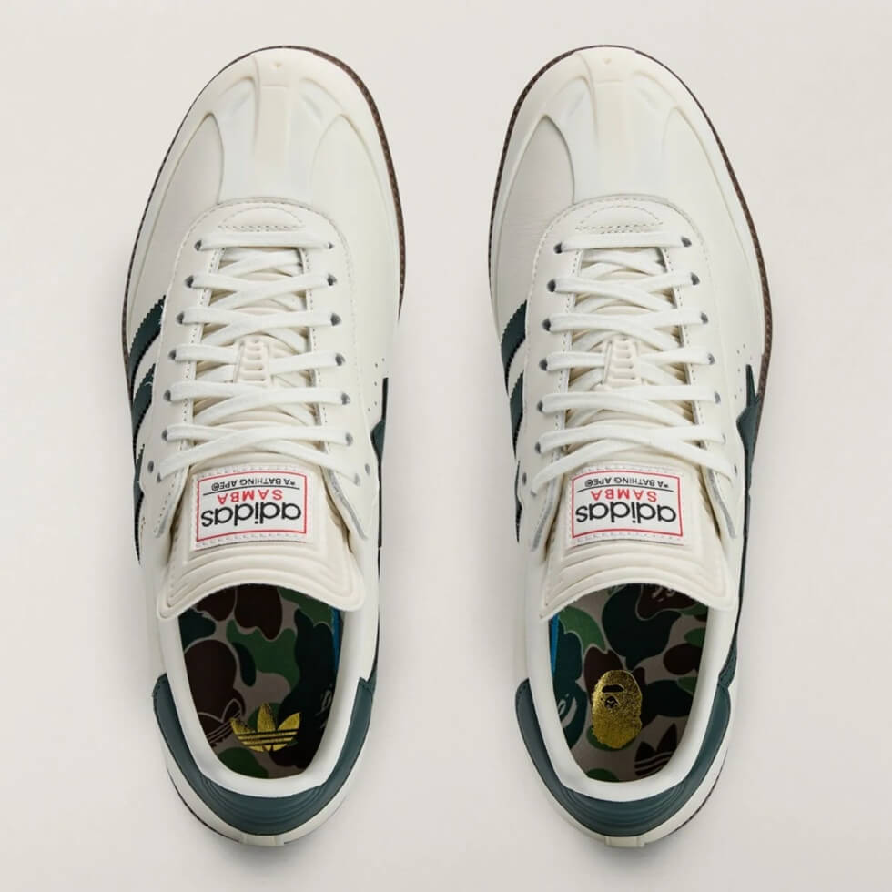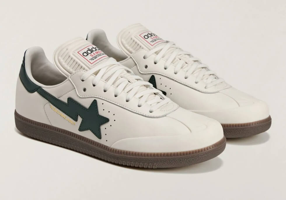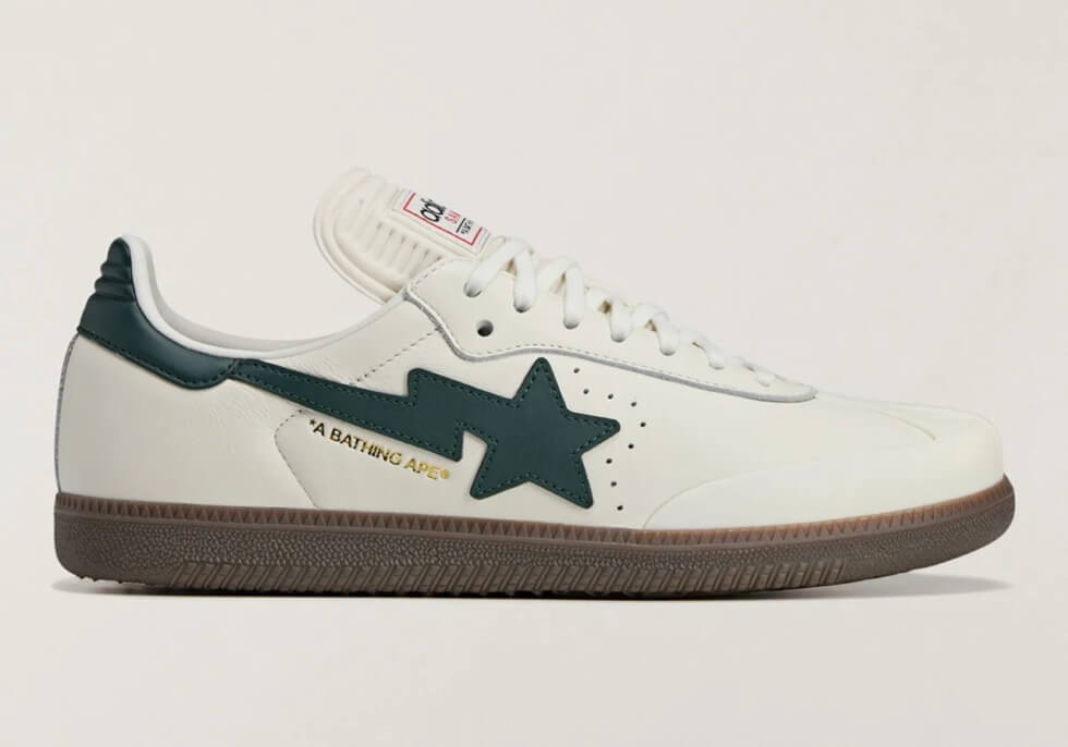 The Samba is by far the most minimalist shoe among the group. It comes with a cream leather upper, adorned by a green BAPE STA on the lateral side, and three stripes on the medial surface. A dark gum sole completes the ensemble.