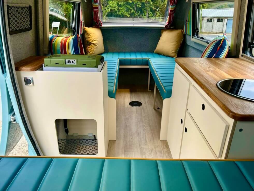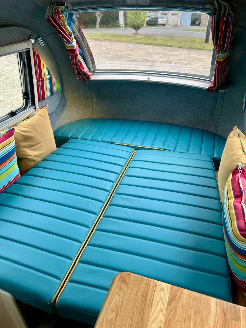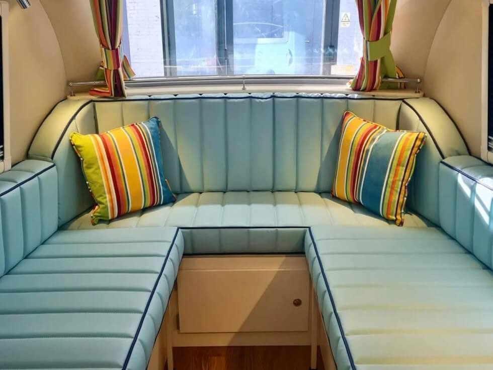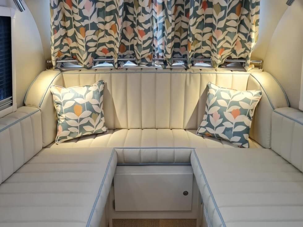 Along with the wooden elements of the cabin, expect a cozy atmosphere inside. “Exceptionally comfortable for lounging, eating and sleeping, with heaps of storage and a versatile layout. Very competitively priced with budget and quality in mind,” writes Barefoot Caravans.