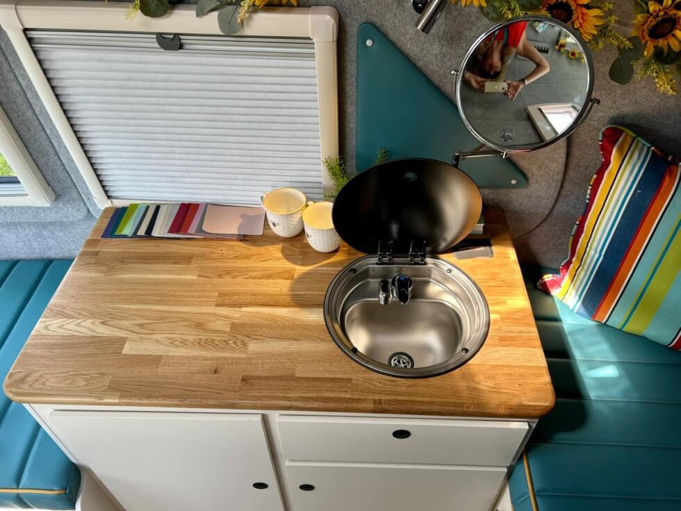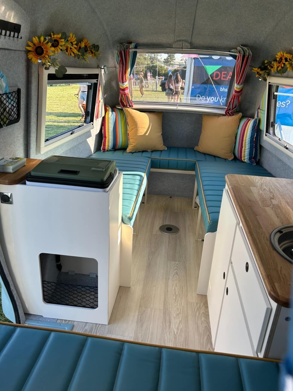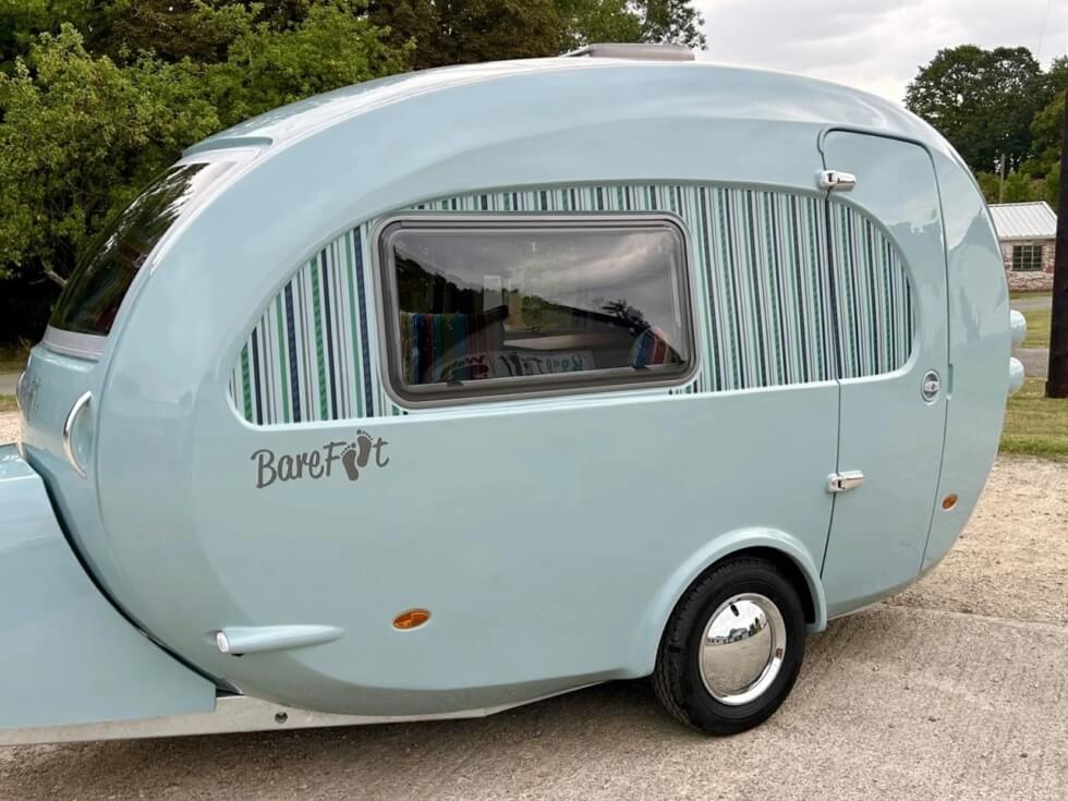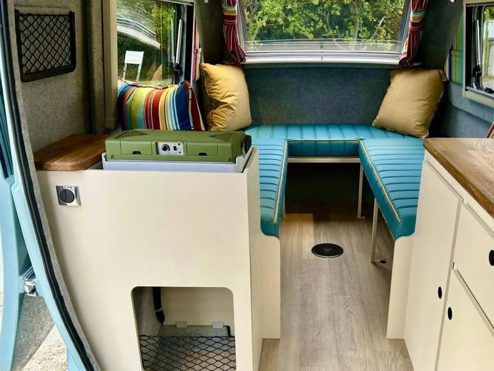Along with the wooden elements of the cabin, expect a cozy atmosphere inside. “Exceptionally comfortable for lounging, eating and sleeping, with heaps of storage and a versatile layout. Very competitively priced with budget and quality in mind,” writes Barefoot Caravans.