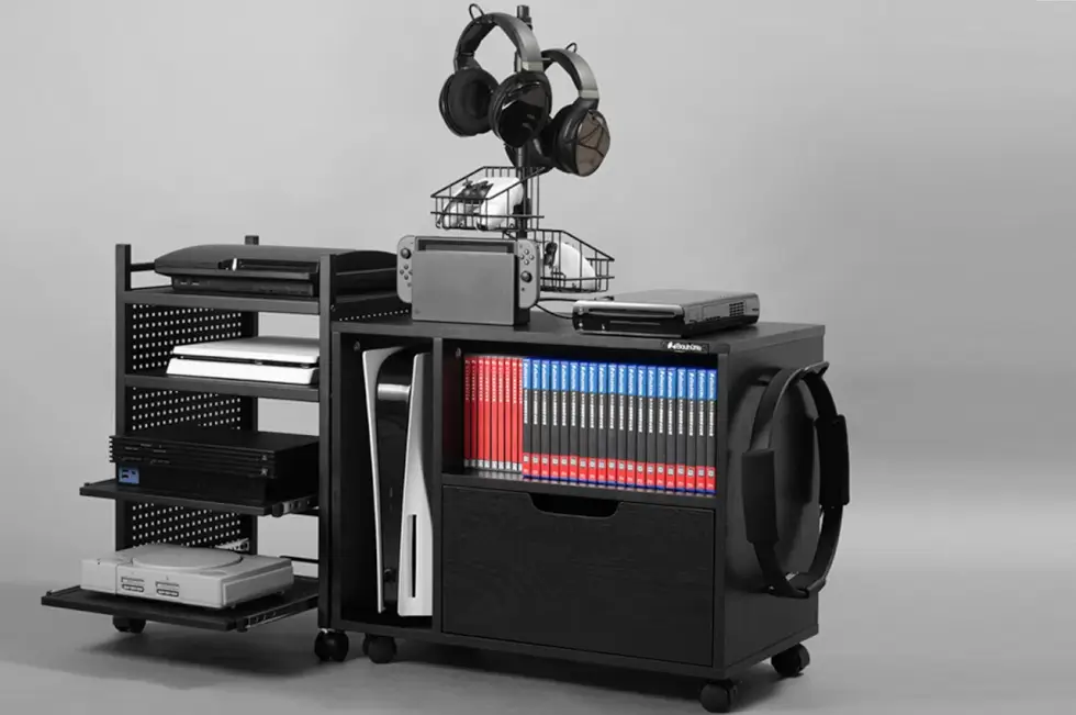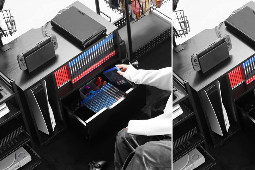 Although the measurements were not provided, the upper-right shelf might have enough space for Sony’s latest console positioned horizontally. The bottom-right is a drawer for various accessories and games, while the shelf above it can also fit multiple standard game cases.