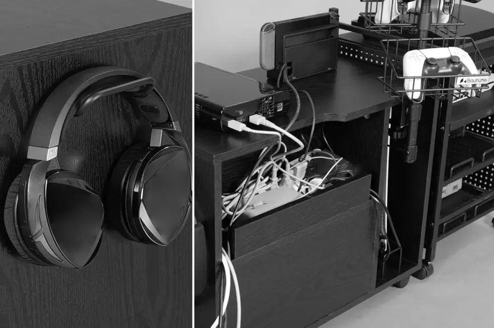 A side hook is likewise included for owners to hang their headsets. In the press images, the cabinet is showcased along with the Bauhütte Game Console Storage Rack (BHS-380G). Of course, we can always mix and match it with other furniture in our living room or man cave.