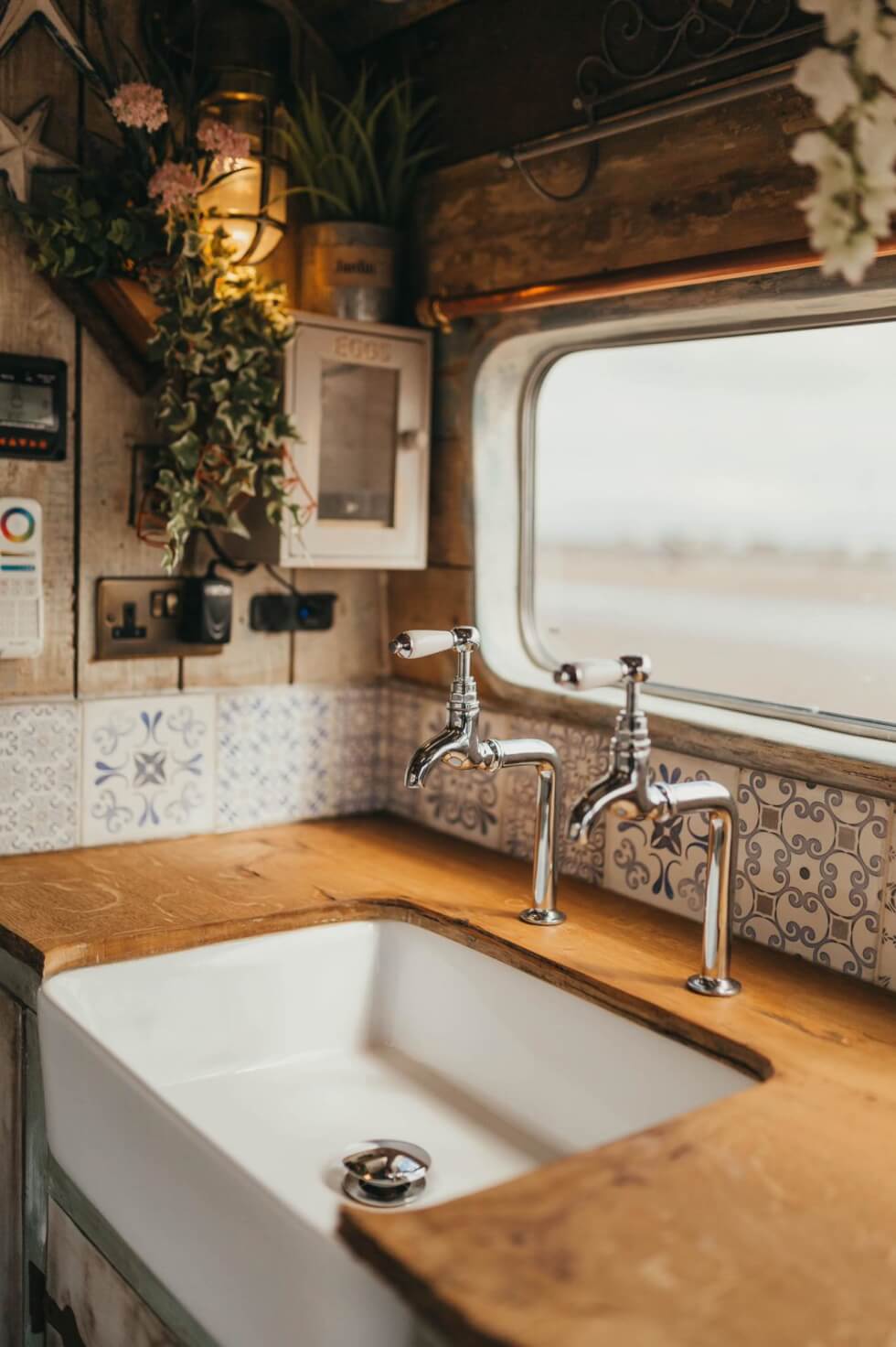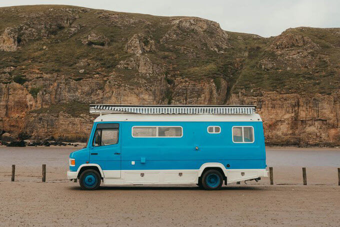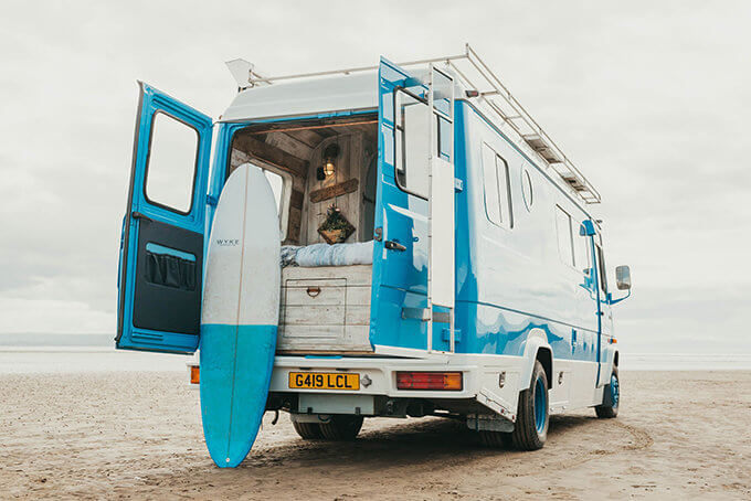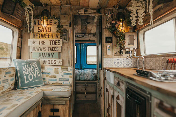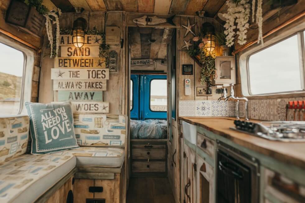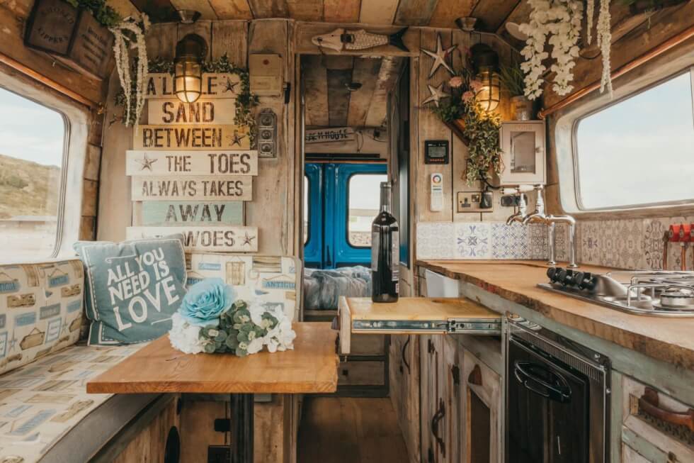 Called Ernie, the Supertramped Co T2 Camper Van comes in a preppy blue and white colorway, gutted and transformed into a surfing-inspired mobile beach hut, with pretty awesome-looking interior decor, to boot. In the main living area, you’ll find a beach seat with a table that sits across the kitchen. The cabinetry is reminiscent of country living, complete with seashells and other sea-life trinkets to enhance the beach feel even further.