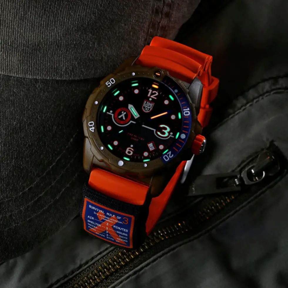 Running its three-hand functions is a Swiss RONDA 515 HF 5 quartz movement with battery life rated for up to 50 months. As with any Luminox watch, low-light visibility never becomes an issue thanks to the micro-gas tubes. Furthermore, this technology allows the lume to glow for up to 25 years. Finally, the textile or rubber strap features a keeper that lists the Rule Of 3 when it comes to survival.
