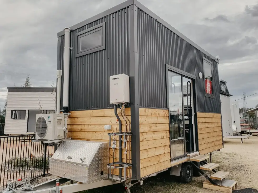 Built on a double-axle trailer, it looks unassumingly simple with its metal exterior reminiscent of shipping containers. But paired with wood accents and a sliding glass door, the house looks homey. Meanwhile, the compact interior feels welcoming and comfortable with an efficiently maximized layout.