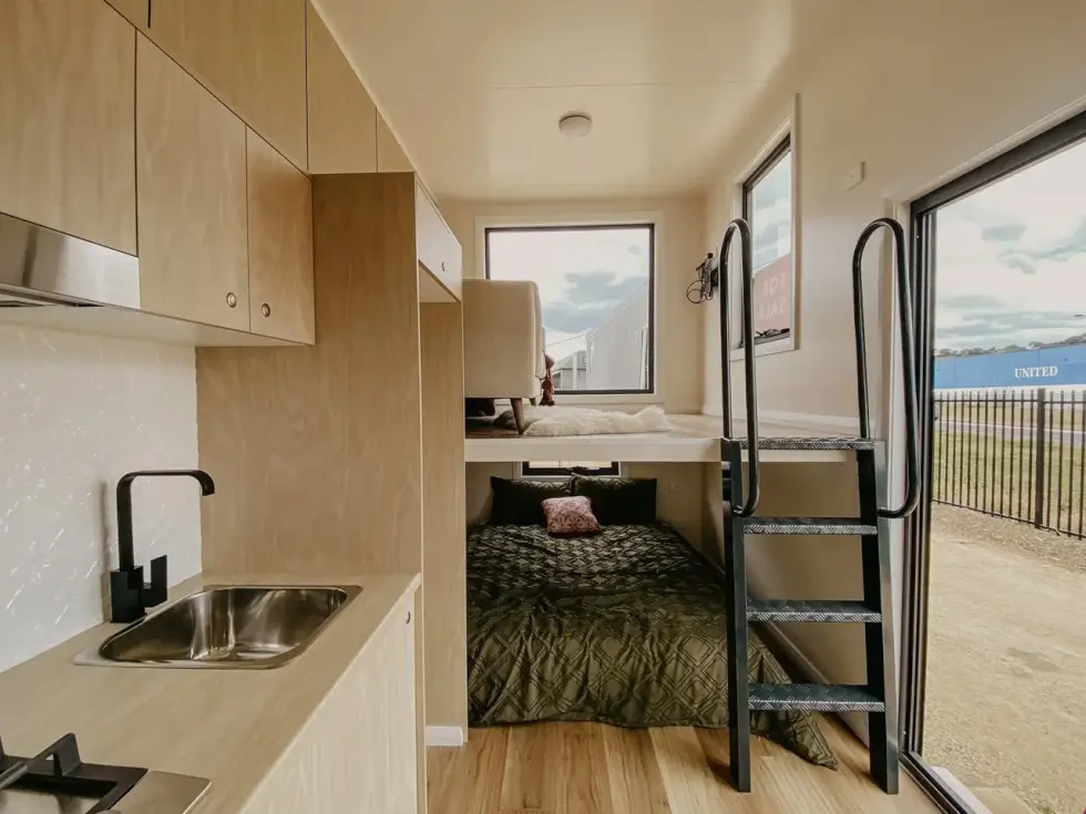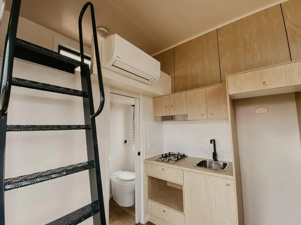 The space under the living room is utilized to accommodate a double bed. This area has a low ceiling so crawling in for a sleep is the best way to get inside. Meanwhile, the entrance leads directly to a kitchenette furnished with a sink and a two-burner propane-powered stove. Then at the opposite end of the home is the bathroom accessible via a sliding door and it has a toilet and a shower.