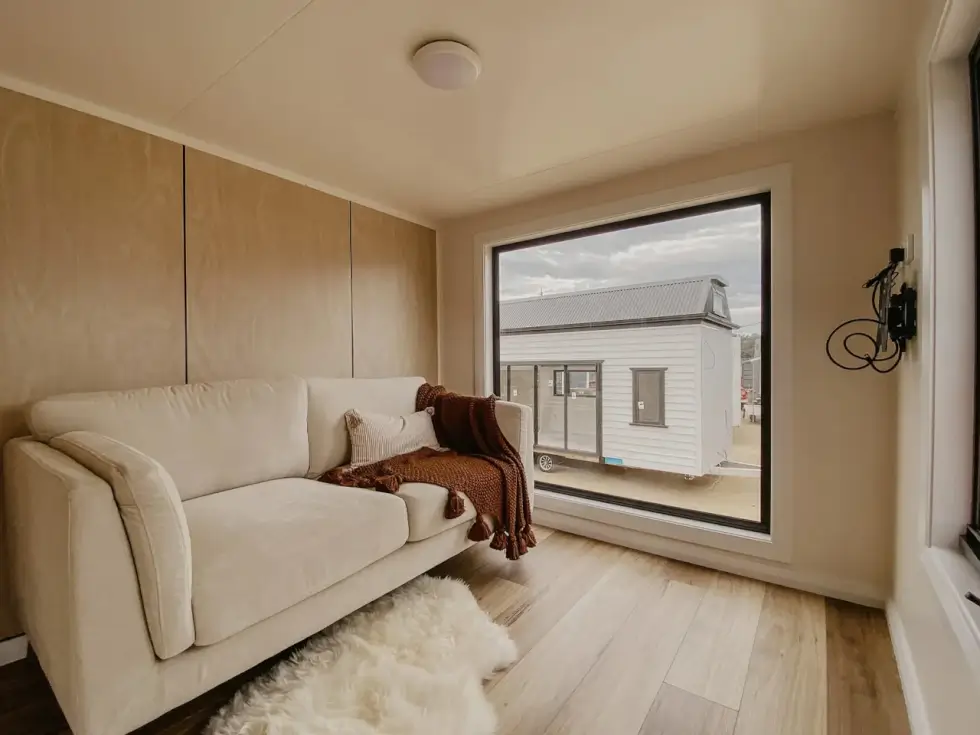 To the right of the Beau River Tiny House is an elevated living room accessible via a few steps. It has a sofa bed that can easily double as extra sleeping space for a guest and a large window occupies its adjacent wall, opening up the space to outside views and sunlight to make it look spacious.
