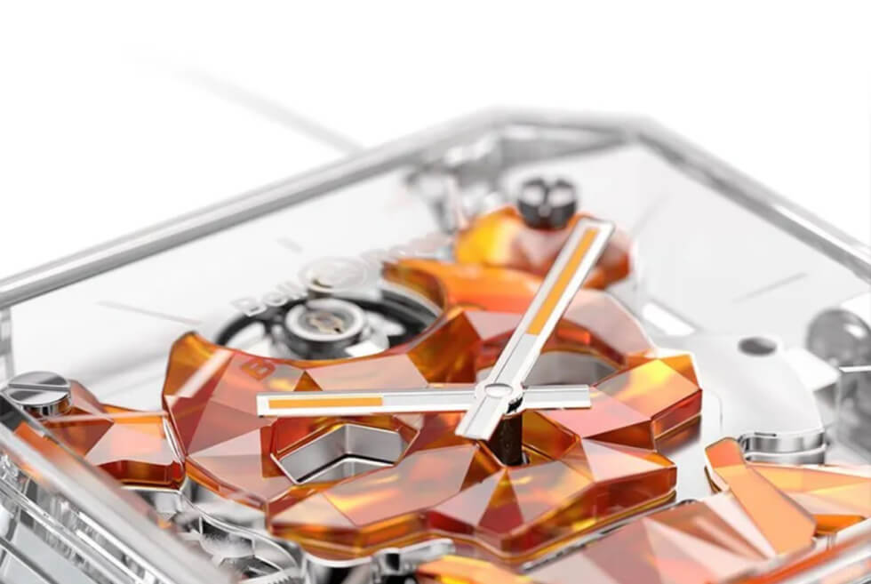 As already indicated by the name, the watch flaunts a 45-mm gemstone case. The level of expertise and engineering that goes into its production elevates it into luxe territory. Sitting within is the namesake – a faceted skull — made up of six sapphire elements with orange metallization,