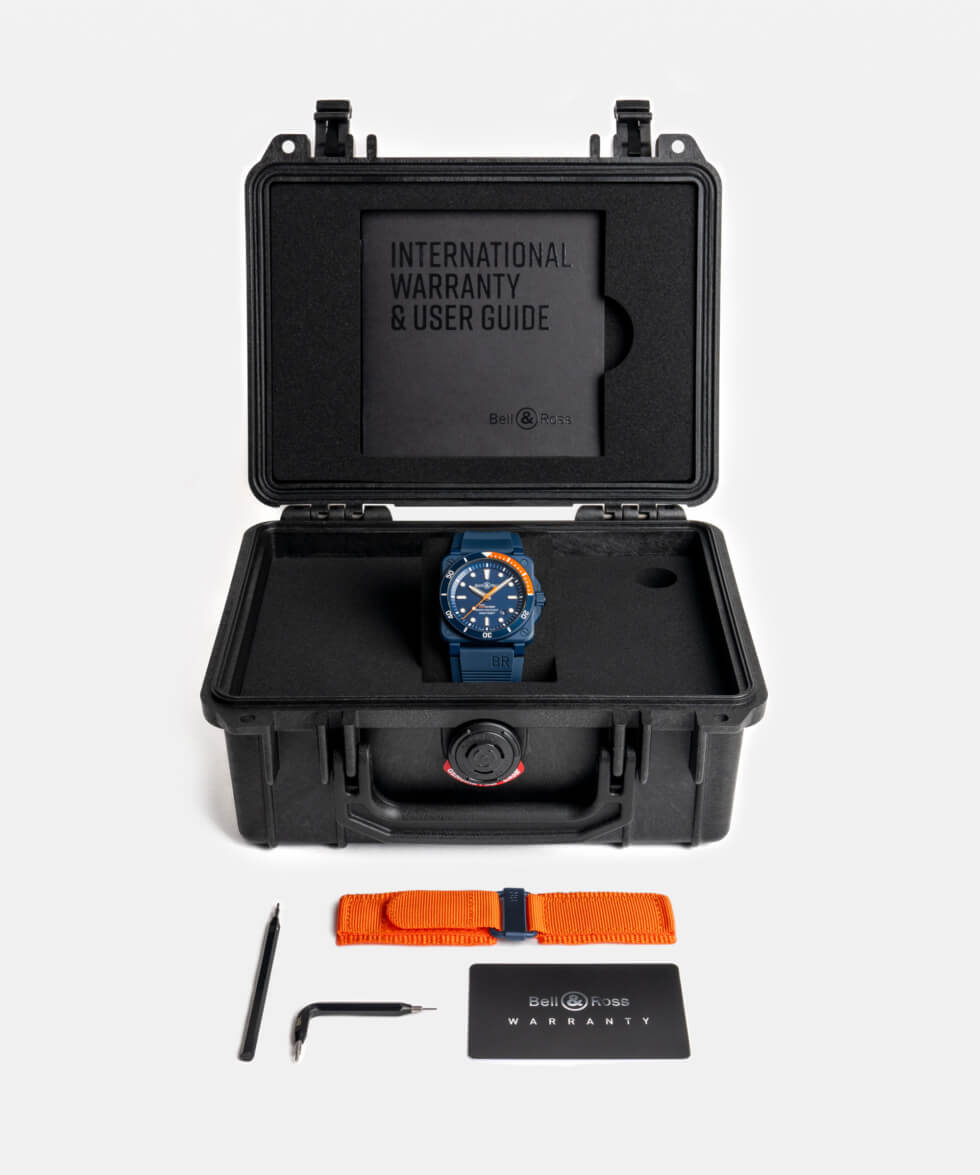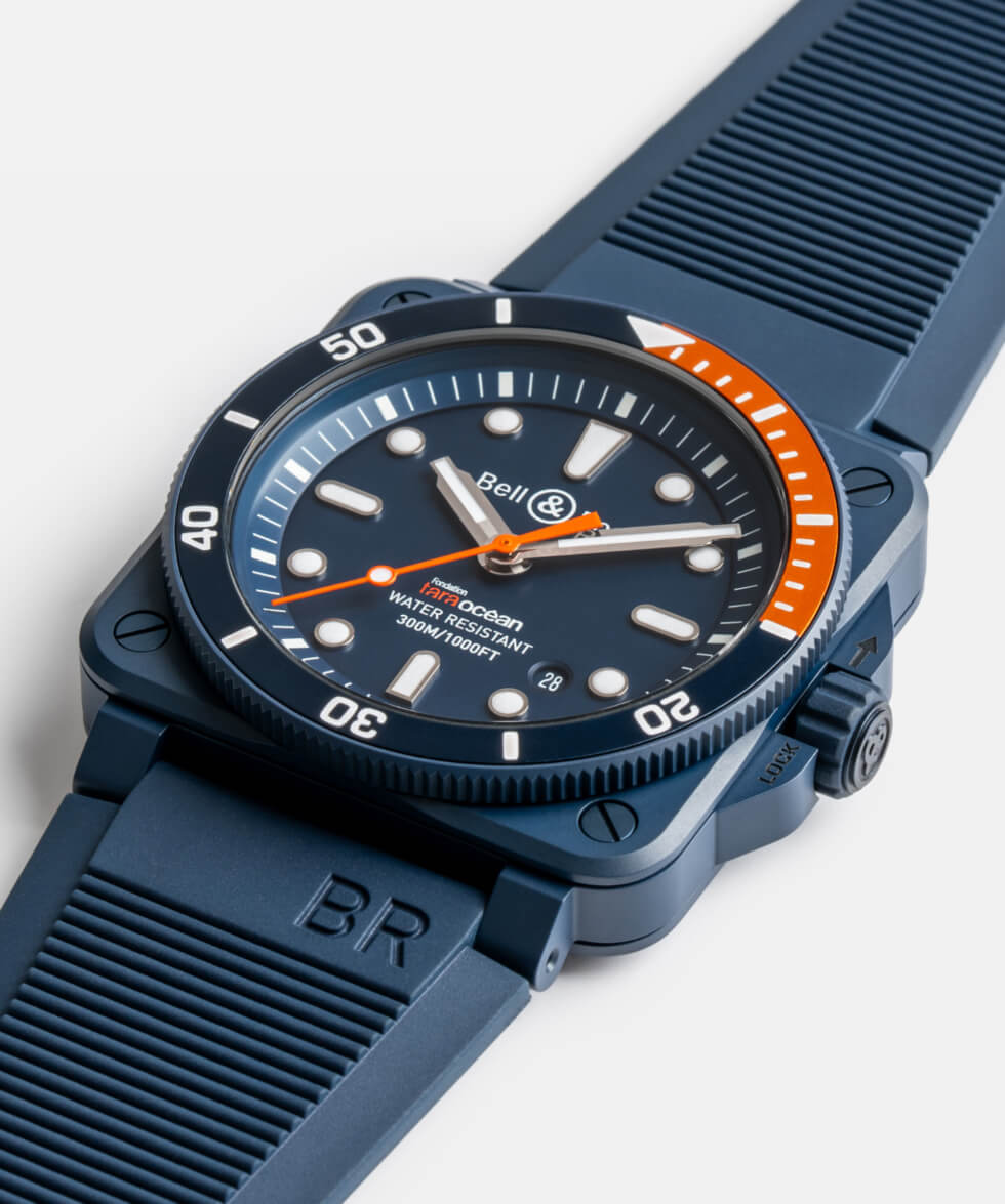 Bell & Ross’ in-house BR-CAL.302 self-winding movement is in charge of the watch’s functions. The 25-jewel automatic caliber beats at a frequency of 4 Hz and boasts a 54-hour power reserve. The BR 03-92 Diver Tara includes a woven blue rubber strap and an orange synthetic fabric strap, both of which come with a steel pin buckle closure.