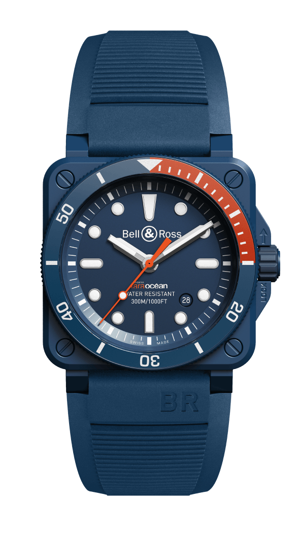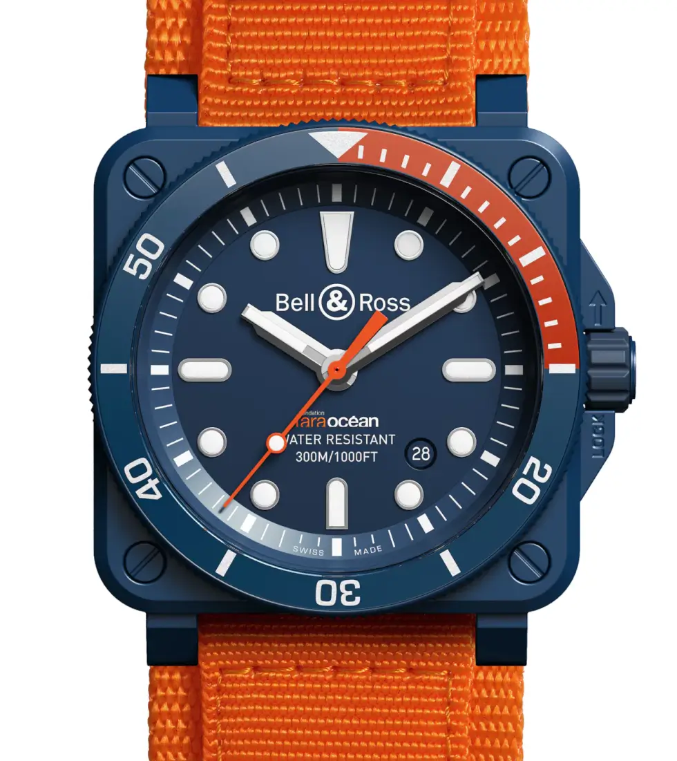 Contrast comes from the 15-minute hash marks rendered in orange. Its dial is adorned with applied hour markers and a minute track on the outer flange. Bell & Ross and Tara Ocean Foundation co-branding are likewise visible on the watch face. Moreover, Super-LumiNova is applied for low-light visibility.
