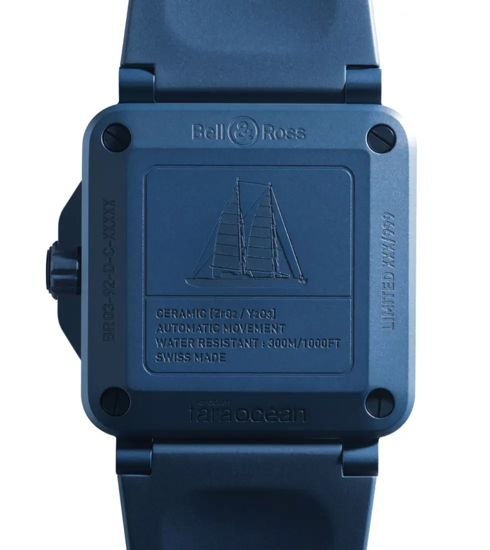 Meanwhile, a circular date aperture is located between the 4 o’clock and 5 o’clock hour markers. The BR 03-92 Diver Tara is rated water-resistant up to 1,000 feet which positions it as a professional-grade dive watch. The case showcases engravings of its serialization number as well as the image of the foundation’s sailing ship christened “Tara.”