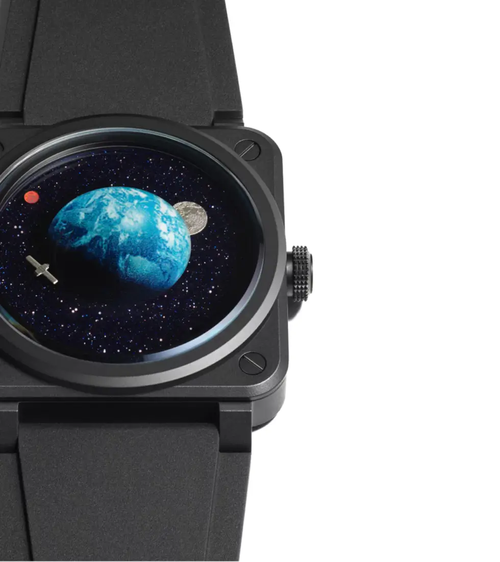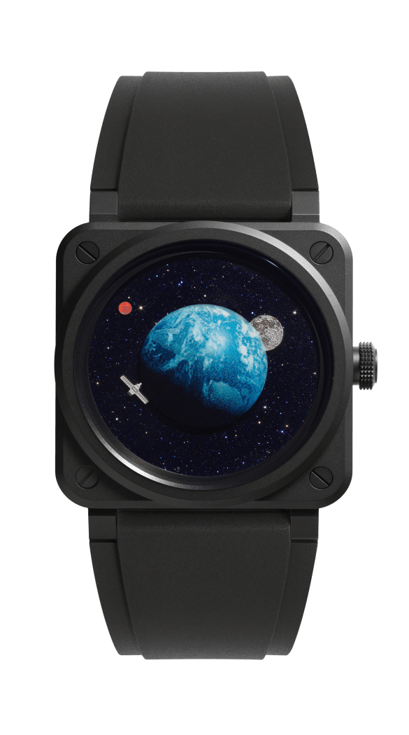 Instead of expressing it along these lines, the BR-03 Astro is opting for something equally spectacular. Against a dark backdrop speckled with stars is an image of the Earth. It is prominently at the center of the dial with three objects surrounding its periphery.