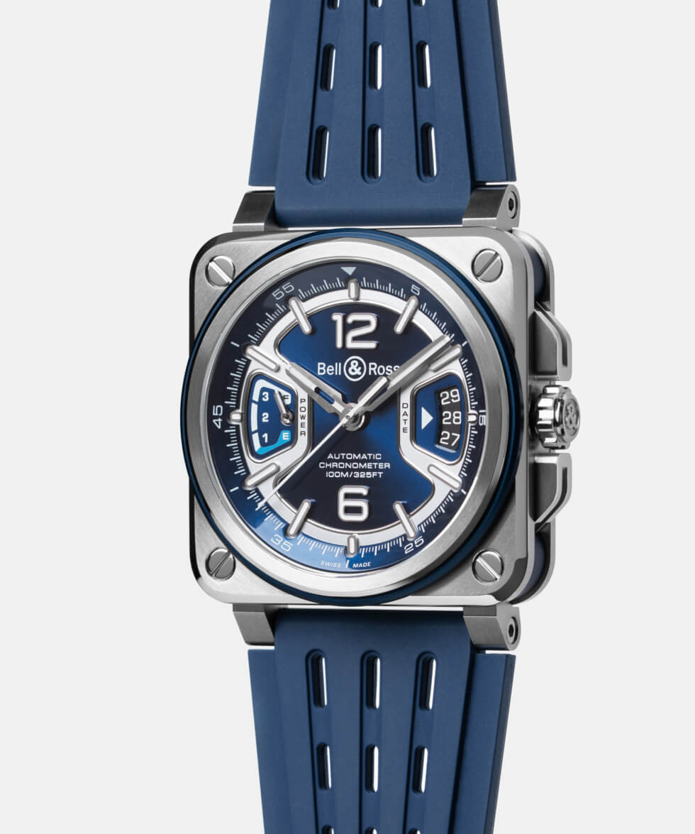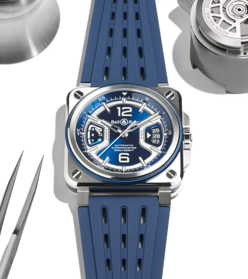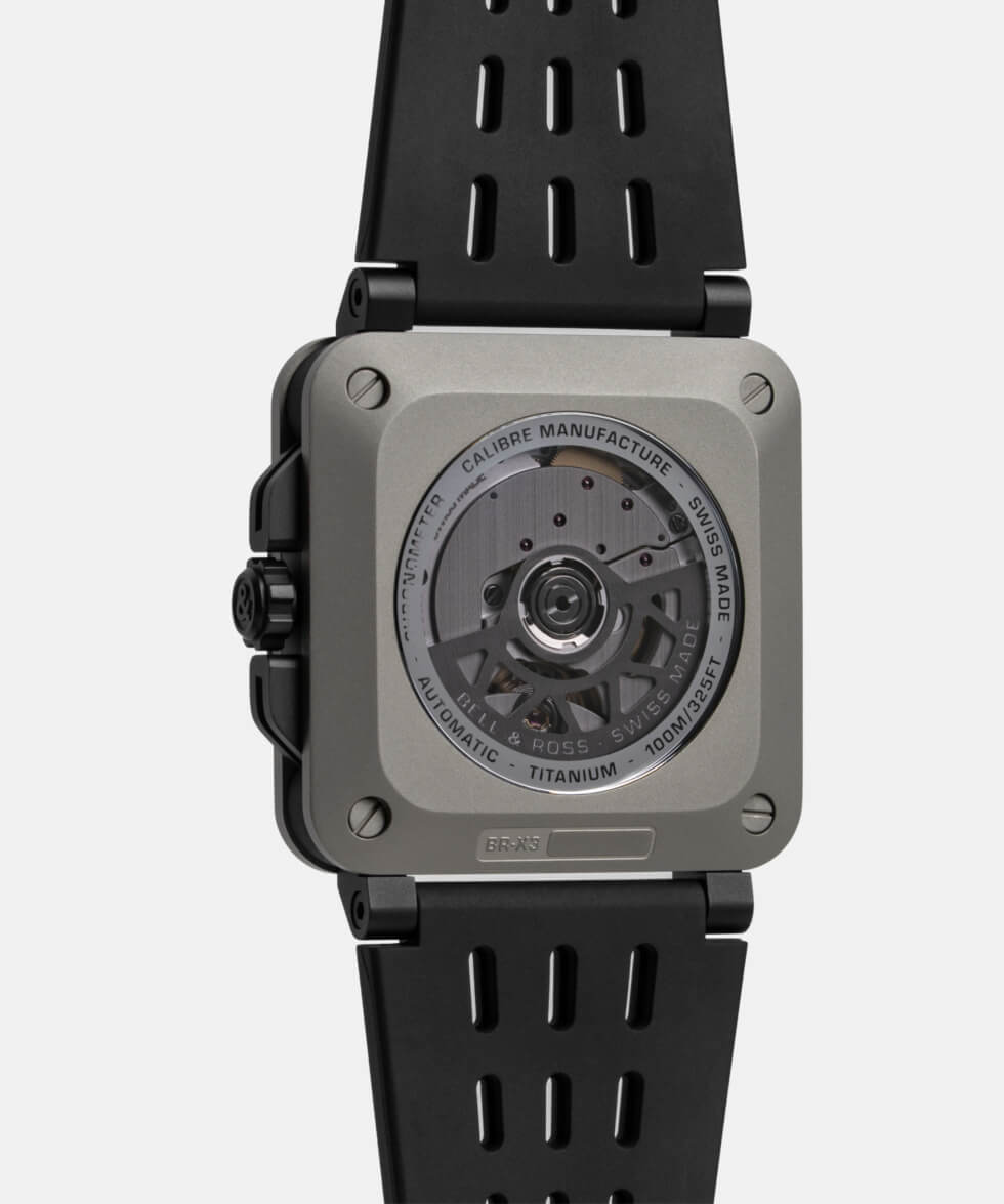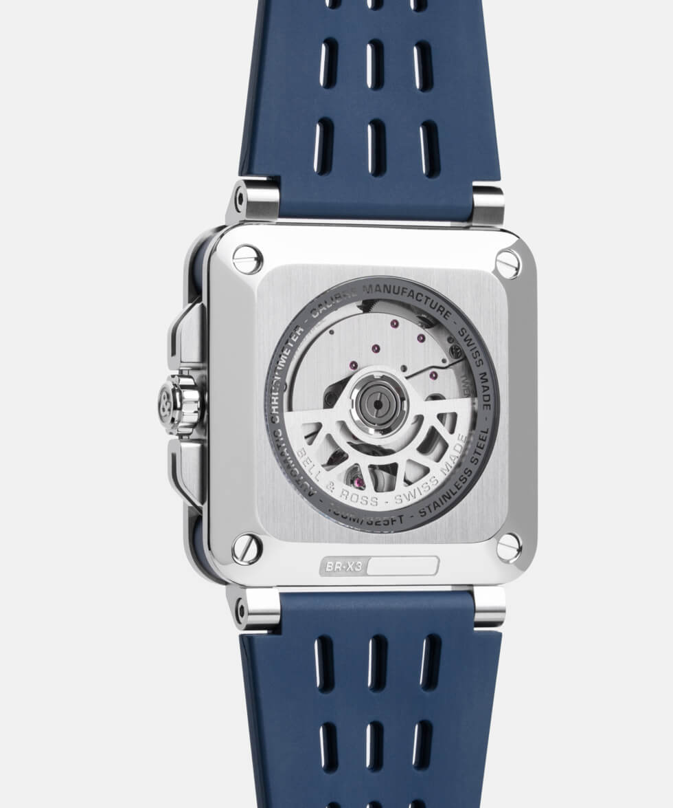 This in-house automatic movement boasts a 70-hour power reserve. The rotor and other sections are visible via a sapphire crystal exhibition case back of the BR-X3 collection. Both the Black Titanium and Blue Steel ship with color-matching perforated rubber straps.