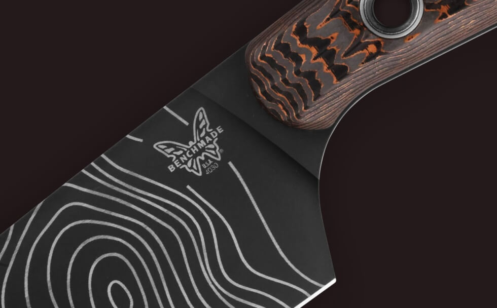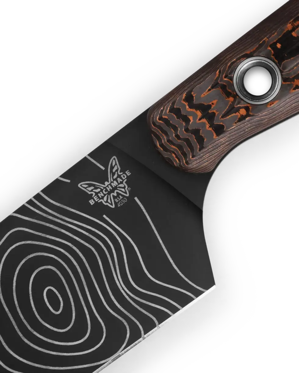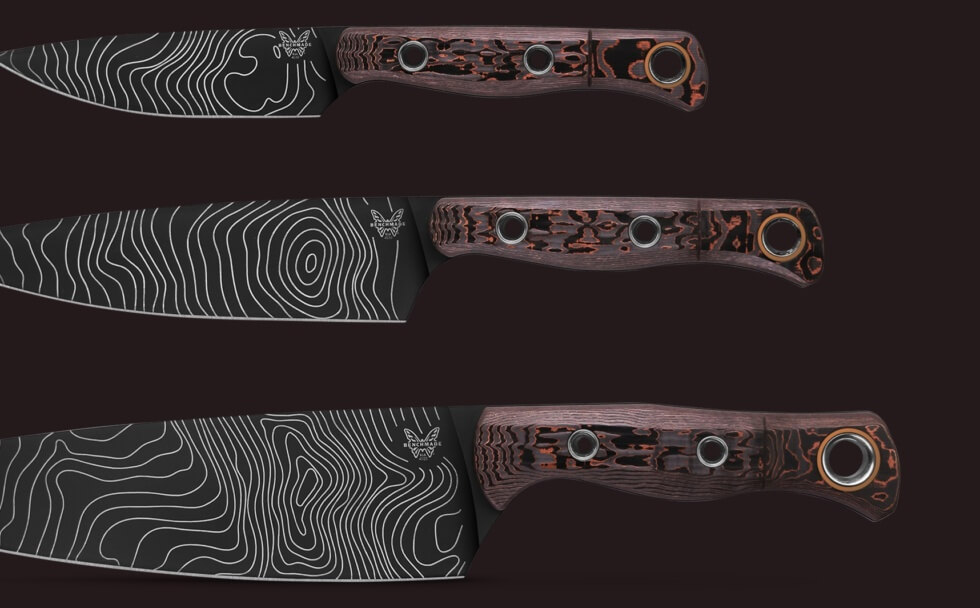 This powder-metal version of the conventional 154CM has a finer microstructure with smaller carbide particles than its counterpart, which results in enhanced toughness and strength.  The blade is then fortified with black DLC coating beneath the topographical lines. Then there’s the handle. Benchmade equipped this 3-piece Cutlery Set in Camo Copper Fatcarbon produced in various patterns and colors. This is a specialized carbon fiber composite that gives the handle its ultralight strength and unique design.
