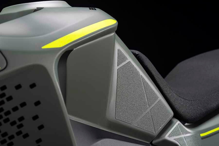 It’s easy to mistake it for another electric moto at first glance with the aggressive styling. You have aerodynamic fairings, a fuel tank, and the tail in a matte finish with special textures. Depending on the lighting, the hue somewhat comes off as gray or army green. It also flaunts neon accents on various sections for contrast.