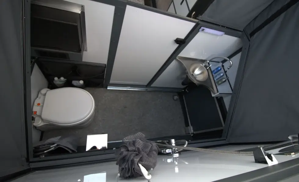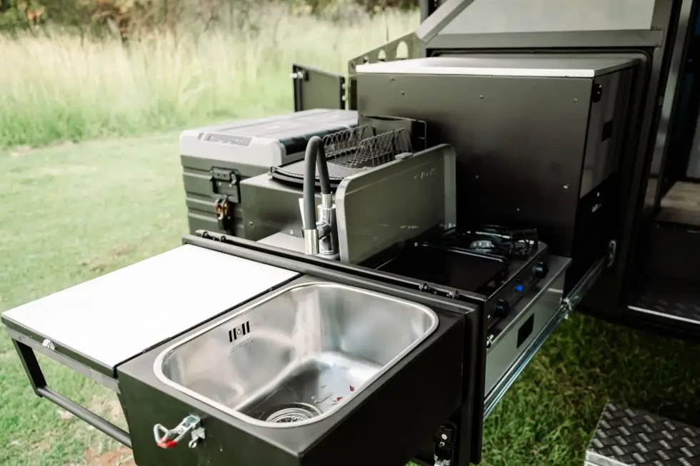 Meanwhile, the CX4 dedicates the external area near the side of the entry door to the kitchen pantry and fold-down countertop. Cooking equipment is accessible from a larger dual-slide setup by the entryway. It houses a dual-burner stove/griddle, sink, small drying rack/secondary work area, and storage options for cooking tools and utensils.