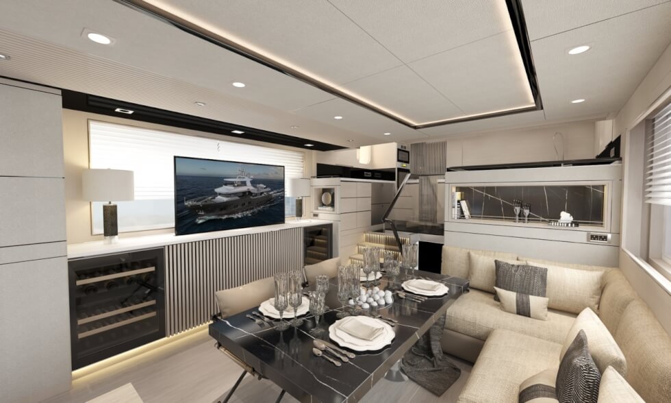 The B72 has a 4,500-gallon fuel capacity good for 5,000 nautical miles at 7 knots. Now that we know the details, let move on to the creature comforts and more. The three-deck configuration gives buyers more space to work with.