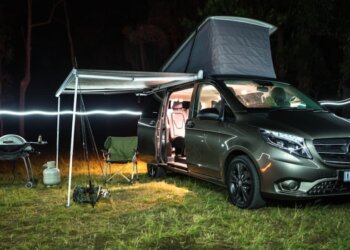 For those who want to cook on the go, the compact kitchen includes a small cooler box, stove, and sink, and the van comes with a camping table and chairs you can set up anywhere to have family dinner in style. And when it’s time to kick back and relax, you can enjoy the built-in infotainment system—or, in an emergency, use it to call for help with the press of a button.