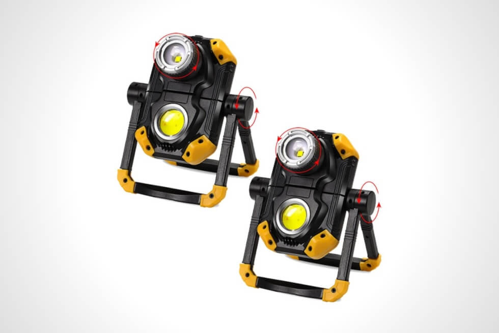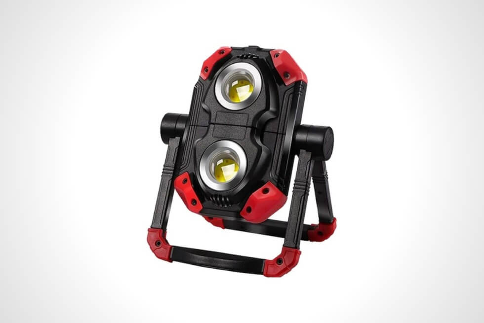 If you want a heavy-duty work light designed to work in almost any condition, this model is an ideal option. You can even dial up the brightness up to 2500 lumens. It is equipped with a 360-degree rotating stand, powerful magnetic handles, and an adjustable zoom. Tweak the lens’ focus to use it as a spotlight or floodlight. The freestanding capability allows for hands-free illumination in any situation. It can also charge USB-powered devices in an emergency.