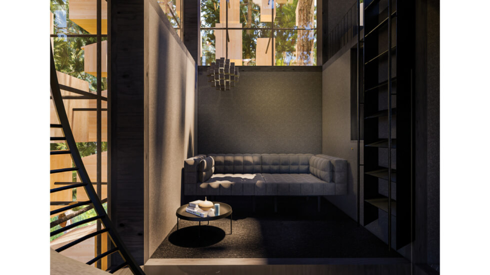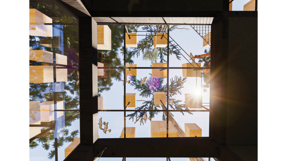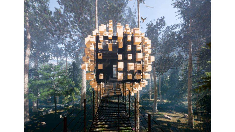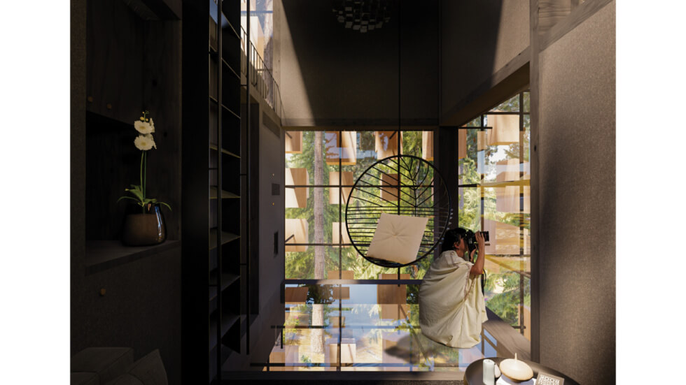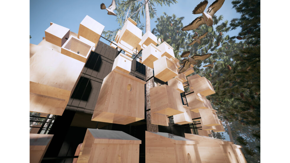 Moreover, the checker-solid conceptual makeup of the interior allows for a range of experiences despite its small space. Guests at the Biosphere also get to experience birdlife in close proximity through a triple glazing facade. The good thing is, the birds don’t drop where they nest so there is a great chance the glass will remain clear within the aviary architecture.