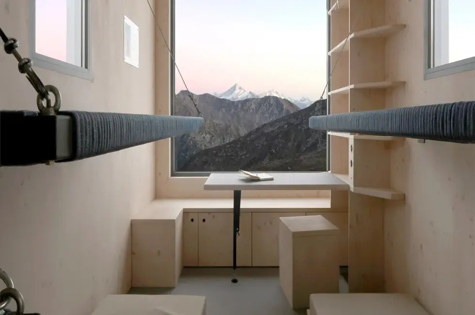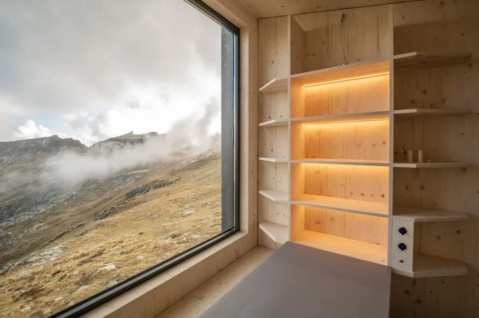 This mountain hut is a family tribute to Claudio Brédy, a local politician and Alpinist, who died at the age of 54 during a mountain excursion in 2017. It has two massive windows that overlook the rocky views beyond specifically the Grivola and Gran Paradiso mountains. The glass window also opens the cabin to the natural morning light, great sunrise and sunset views, and views of the starry sky at night.