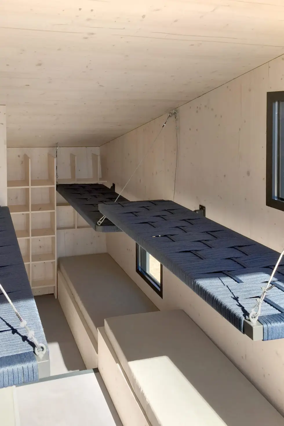 Meanwhile, pale timber marks the interior design and there are two large windows that create a sense of being in harmony with the natural surroundings. There are six bunk beds, a desk, a bookshelf, a window seat, and an entrance area with built-in storage space.