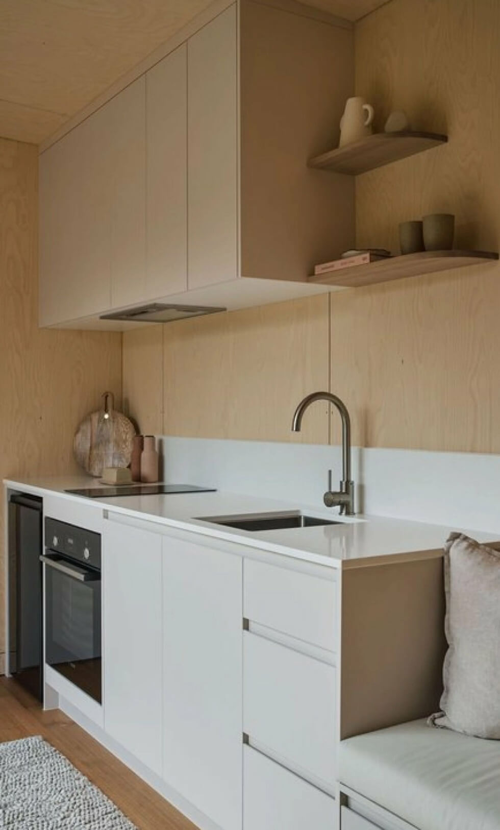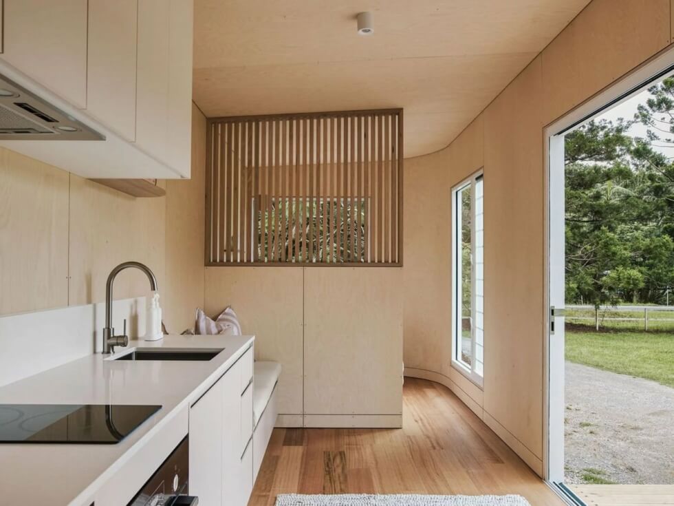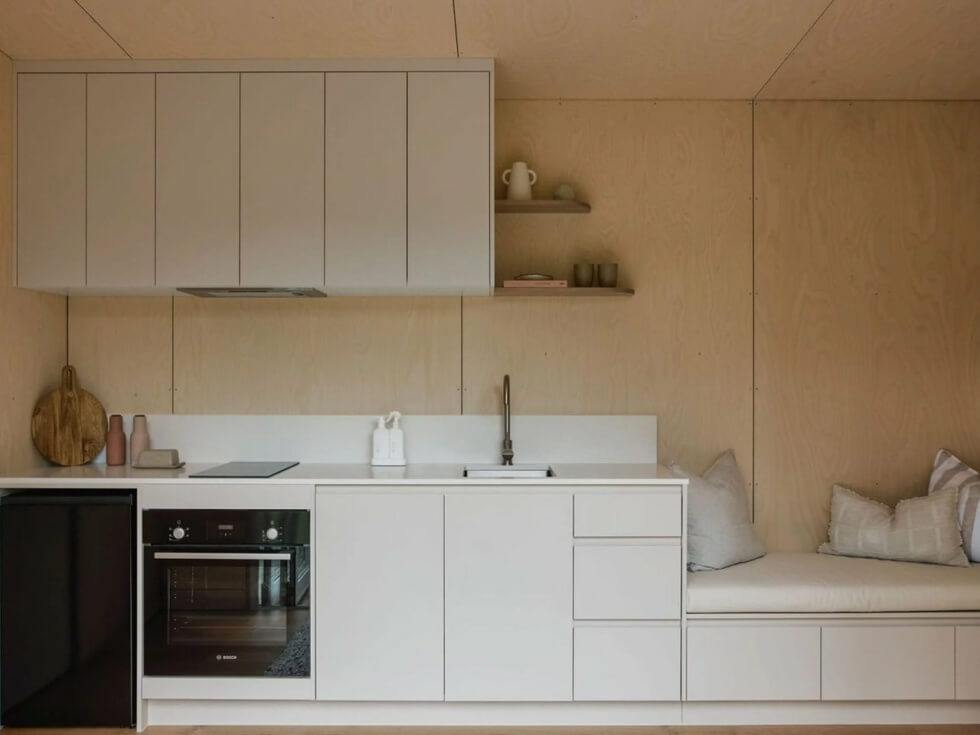 The kitchen has an electric two-burner stove, exhaust fan, floating shelves, and room for a built-in bar fridge. It shares space with the living area, which has a bench seat lounge with built in storage drawers and a curved breakfast bar.