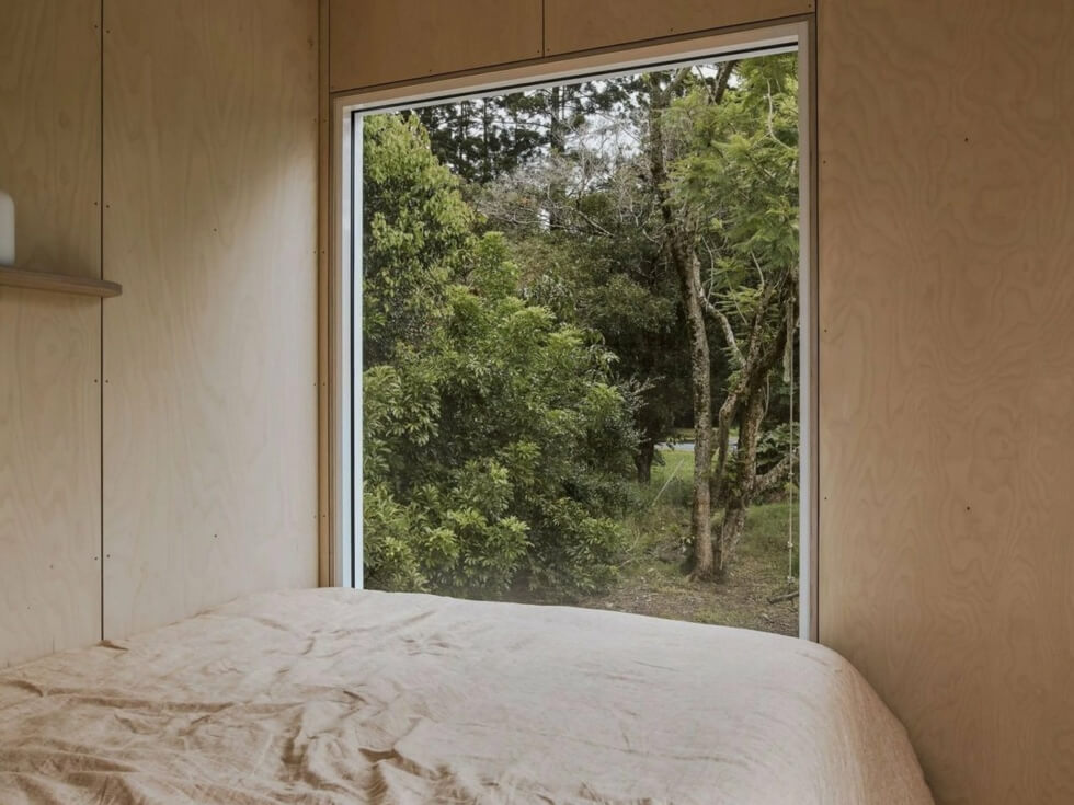 Meanwhile, on the opposite end of the home is the bedroom with a timber oak screen for privacy. Harper sleeps two on a queen-sized bed with built-in cabinetry. Then on the opposite end is the bathroom, which has a flushing toilet, concrete basin, shower with fixed glass screen, and mirror cabinet. This model is also customizable with off-grid capabilities.