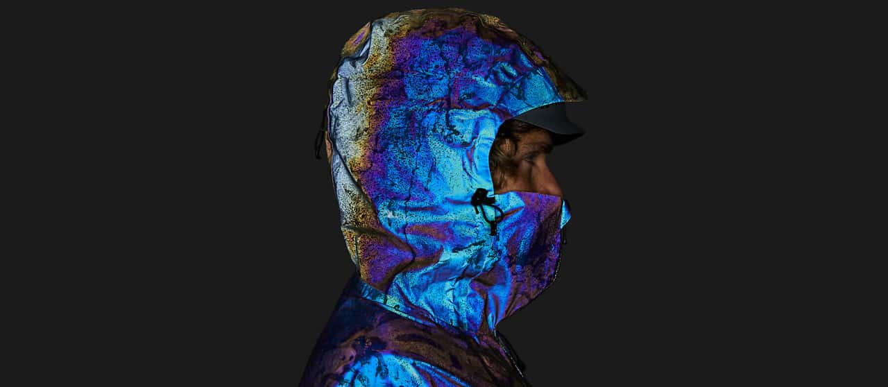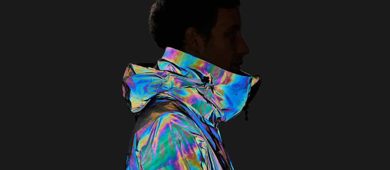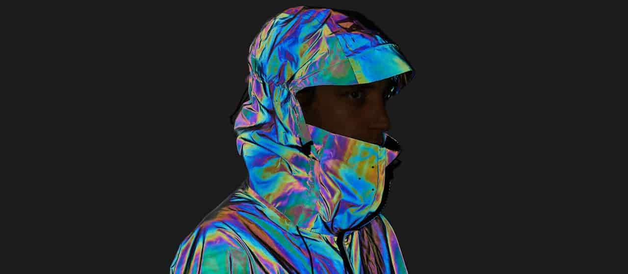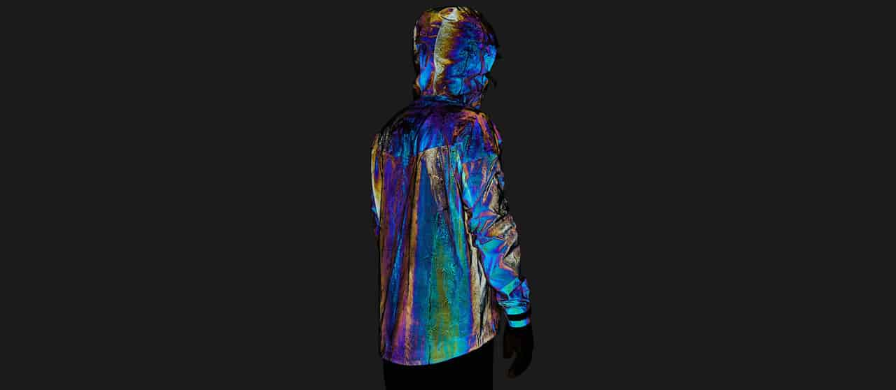 Vollebak replicated elements of this survival mechanism and created a jacket that dynamically shifts in different environments. The design involved using lasers, resin, and more than 2 billion microscopic glass spheres. The result is a snowboarding or ski jacket that seems coated in metal or oil at dull light. Then is a magic soup of color and sheen when exposed to very bright light.