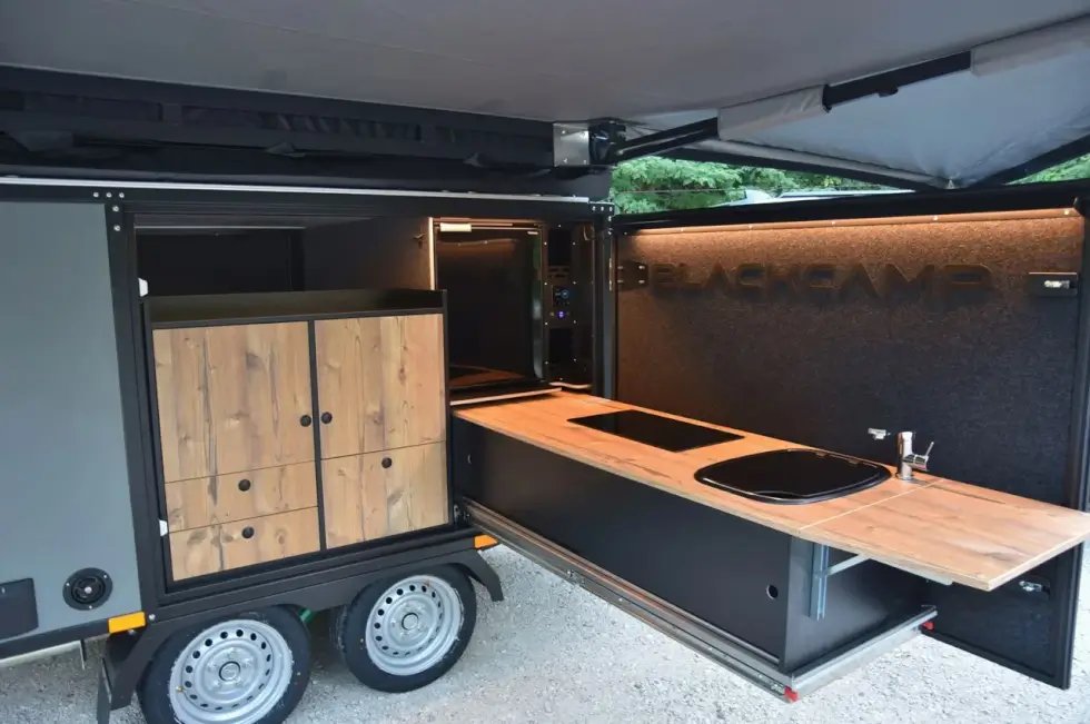 Blackcamp thoughtfully designed all parts of the trailer to accommodate a kitchen upfront accessible via a pull-out adjacent to the storage area. It comes equipped with a two-burner gas hob, a pull-out shelf to store cooking and eating utensils and more, a cold-water washbasin, and a generous 63L fridge. So you can easily whip up a good meal even in the great outdoors.