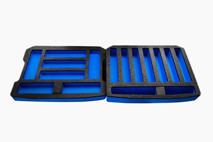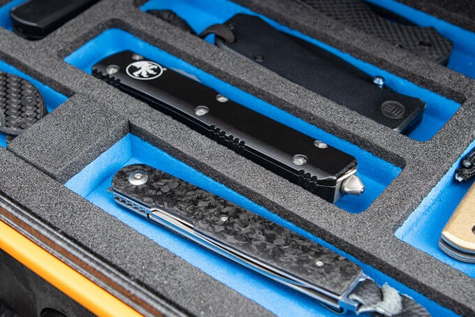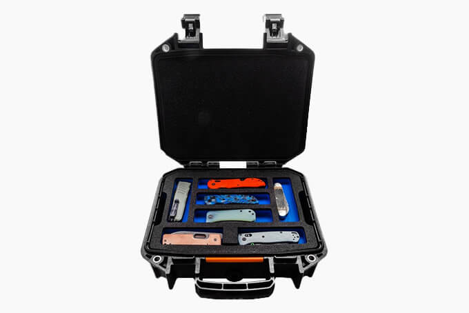 BladeHQ’s Pelican Vault has thick foam inserts made from Nalpak foam to hold 16 knives horizontally with two layers of foam displays. The foam inserts not only works to segregate your tools but protect them as well.