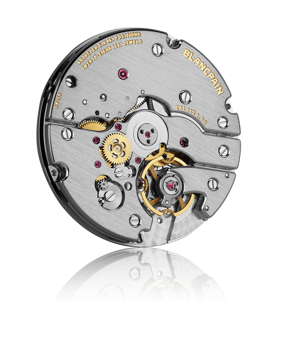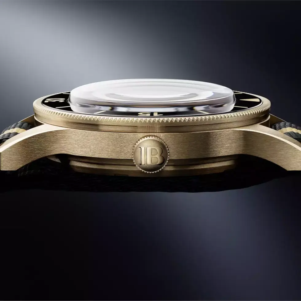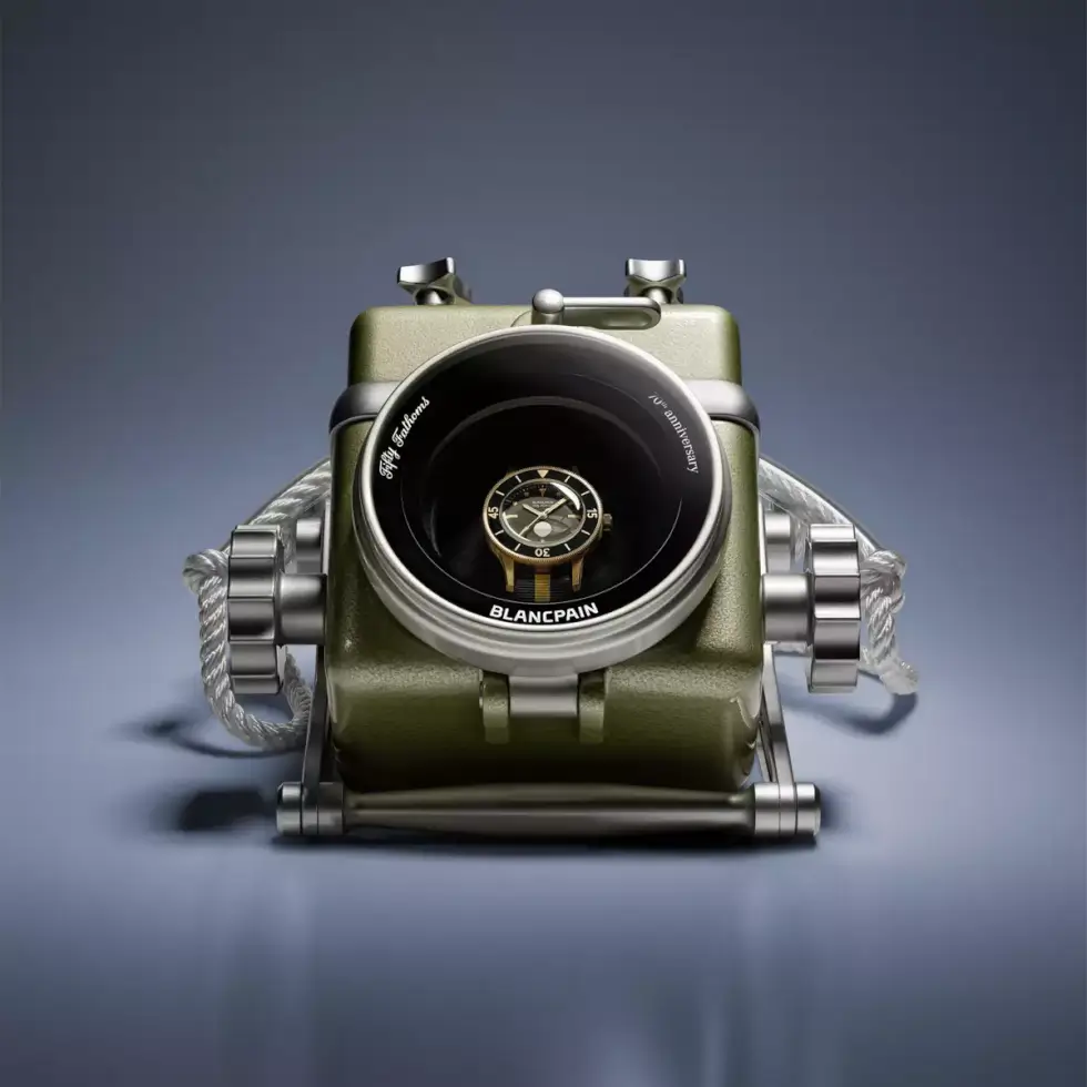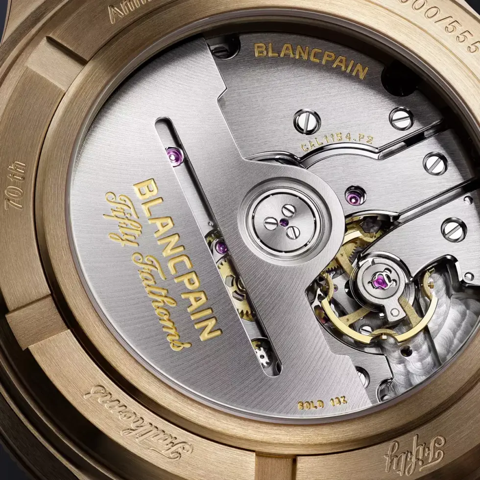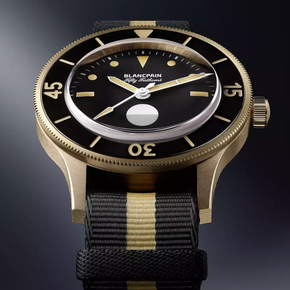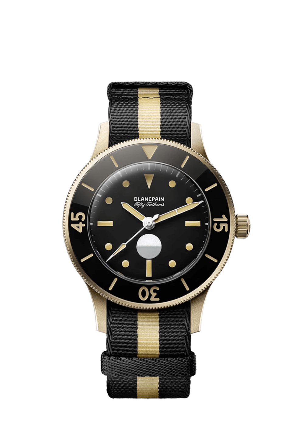To the right of the case middle is a crown engraved with JB and the case back comes with a sapphire window to view the in-house Caliber 1154.P2. The 192-component, 28-jewel self-winding movement measures just 3.5 mm thick and vibrates at 3 Hz with a 100-hour power reserve. The Fifty Fathoms 70th Anniversary Act III uses a NATO strap with a pin buckle closure.