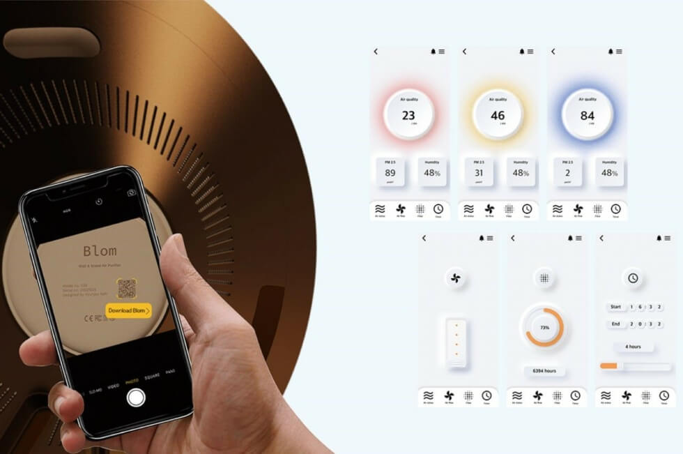 Moreover, this device boasts smart features to enhance its functionality. Users can register their item through a QR code found on the back of the purifier and operate it using an accompanying mobile application. Aside from cleaning the air, the BLOM Air Purifier also serve as a digital clock. This dual functionality makes it a great addition to any space, serving not just as an appliance but also a stylish timepiece.