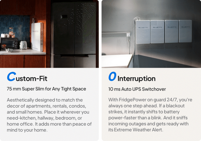 As its name implies, it ensures your refrigerator keeps running even when not connected to the local grid. It’s a backup battery that takes minimal space, mounted on the kitchen wall, or even placed above the fridge. It’s merely 75 mm thick (under three inches) and is light enough to carry around, at 19 kg (42 lb).