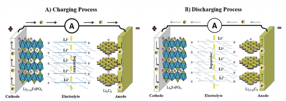 During the charging process, the batteries release lithium ions from the cathode to transport them over to the anode via the electrolyte. The opposite reaction takes place during power discharge. The lithium ions move from the anode to the cathode and the movement is what creates the electric charge that supplies the power.