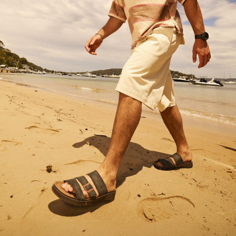 The Aerocork sandal requires no break-in for instant utility straight out of the box. It instantly molds to the feet and feels comfortable from the first step. It is available in three models: #2693, #2694, and #2699, each available in Sand, Rustic Black, and Rustic Brown colorways.