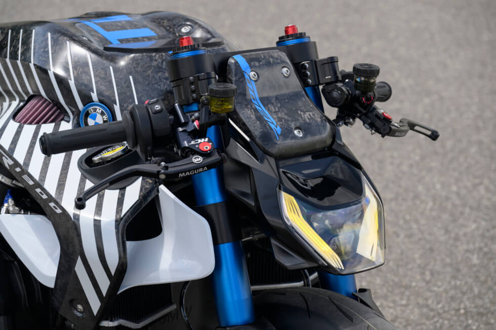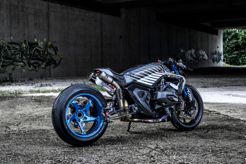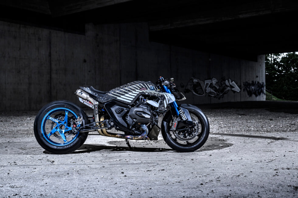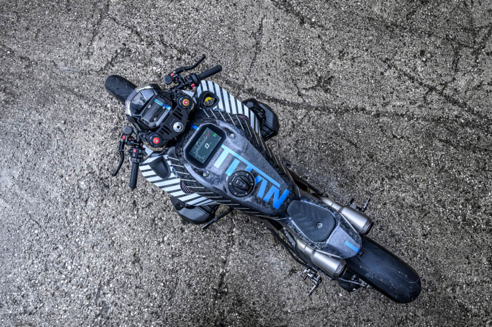 In the words of BMW Motorrad’s Head of Communications, Tim Diehl-Thiele, the pipes enhance “the powerful character of this custom bike, both visually and acoustically.” It’s easy to miss, but between these sits a nitrous oxide tank for that extra boost. Other notable features of the TITAN include a Wilber chassis, forged carbon fiber elements, and Magura HC3 brake levers.