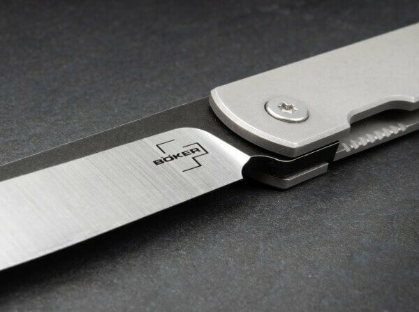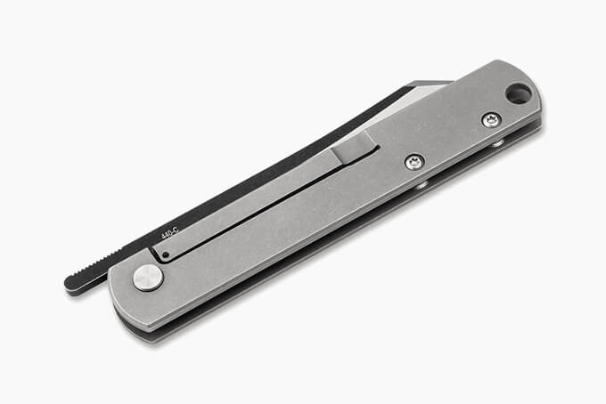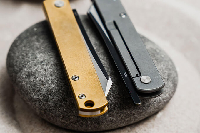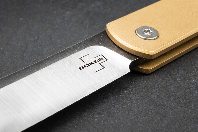 This pocketknife comes in brass and stainless steel variety and both pack a 2.95″ long reverse tanto blade with an overall extended length of 6.69″. This in itself is a true homage to the classic Higo profile but Böker adds modern conveniences to make their take look fresh. These include a swedge at the tip and the choice of two slab handle scales instead of a single piece of folded brass iconic to the classic Higonokami.