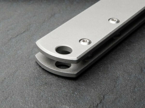 The stainless steel version of this folder has an extended tang opener which is intact. It incorporates a frame lock and has a matte stonewash finish for the handle. Meanwhile, the brass model does away with the extended tang altogether and is a two-handed slip joint with a stonewash finished handle.