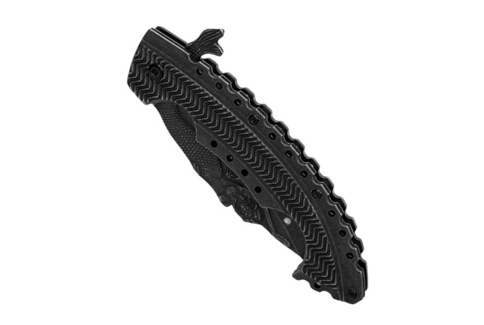 This is an imaginative folder dedicated to these mystical ocean creatures. This version comes in a black stonewash finish to give it an older, mysterious appeal. The drop point blade is 440A stainless steel with a flat grind and plain edge yet still capable of carving out serious tasks. The blade is sized just right at 0.14″ thick, 1.25″ wide, and 3.78″ long. It opens via a flipper and locks in place via a jimped liner lock.