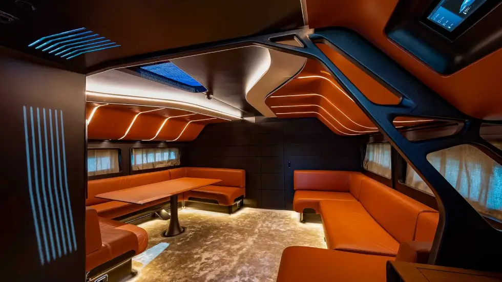 The helm area is upholstered in burnt-sienna leather and features an Alcantara-wrapped steering wheel. Up to three people can strap in to enjoy the Bolide 80’s capabilities in the most immersive way possible. When you want to relax after a day of thrills, the lower deck welcomes guests with its lavish leather trims and carbon fiber elements curated by Loro Piana.